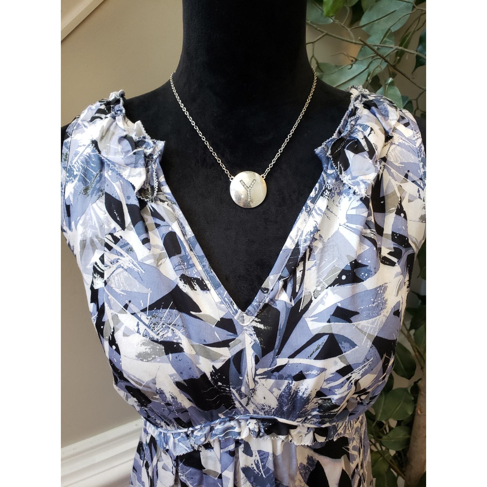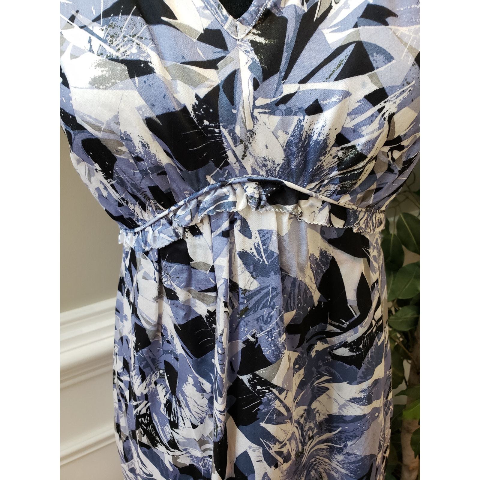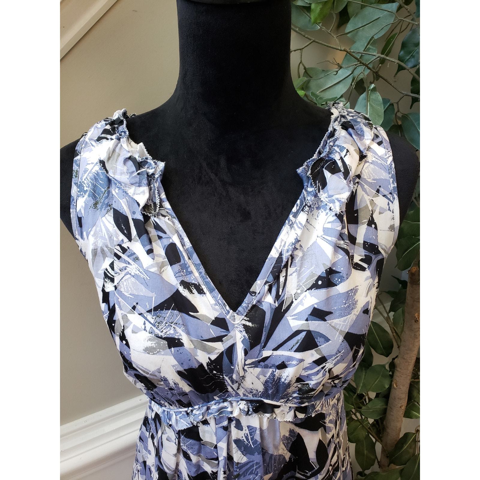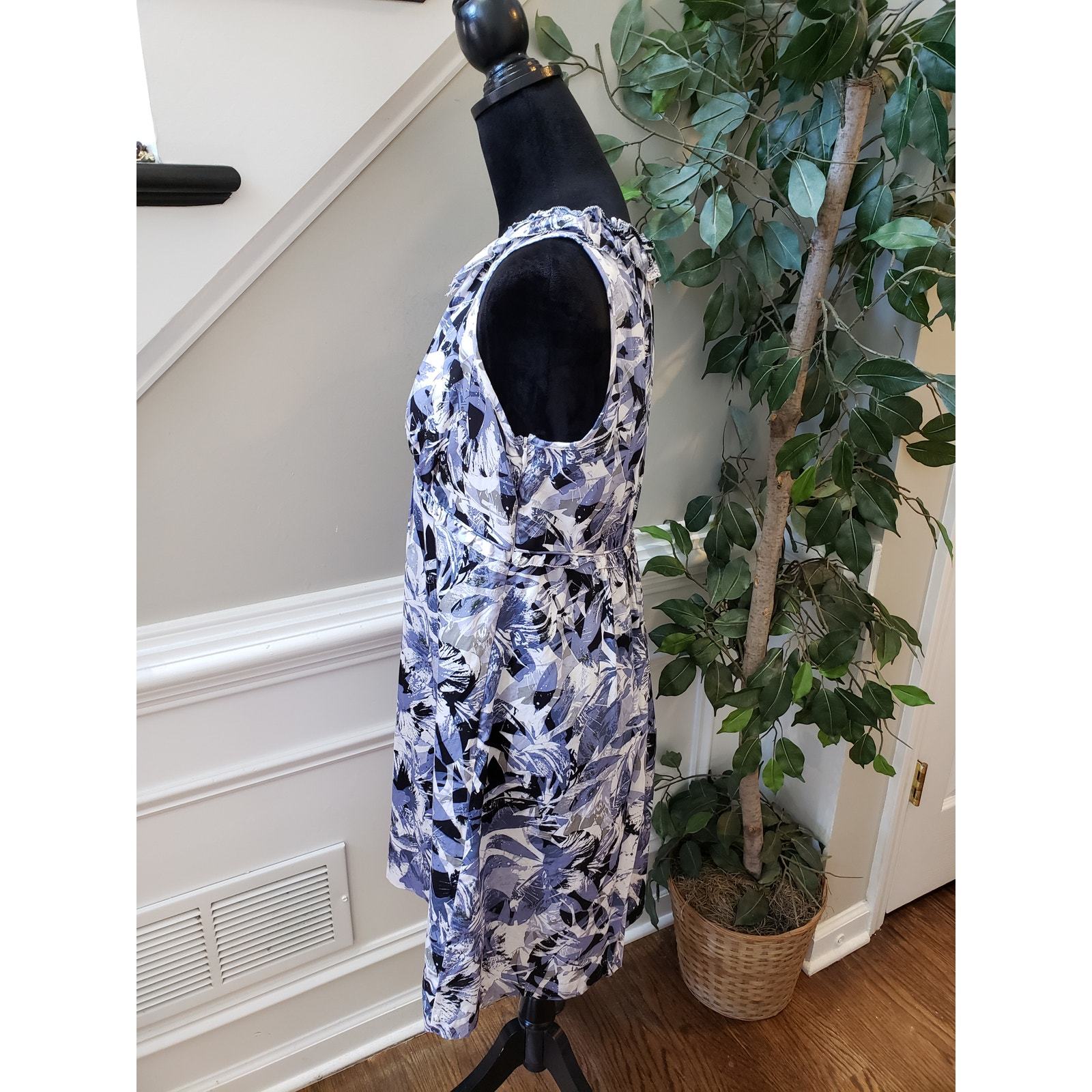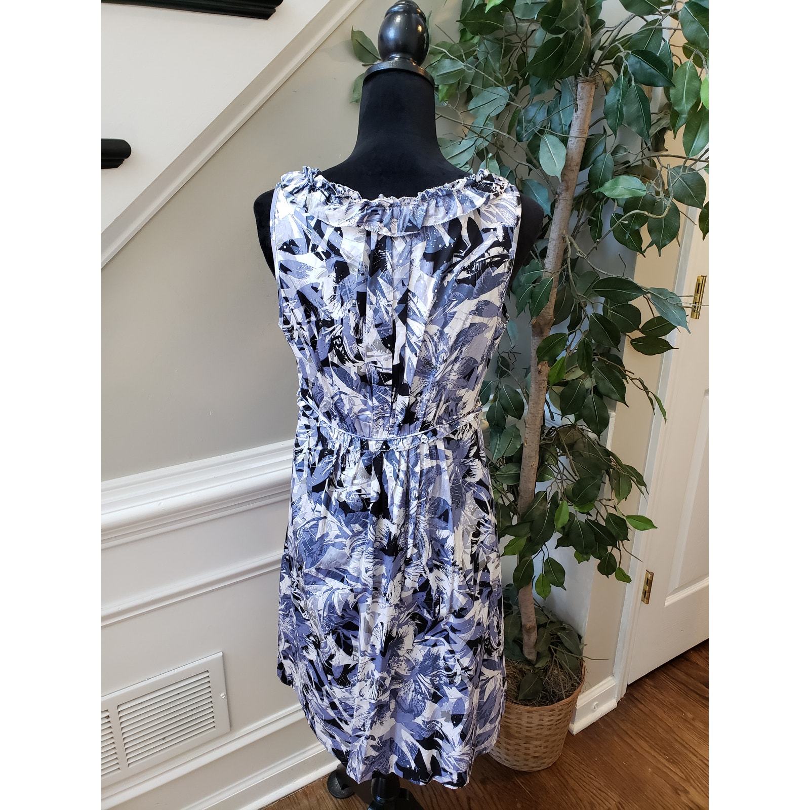 Alfani Fit Flare Dress Womens Petite 10 Blue Ruffle Cotton Sleeveless V Neck
