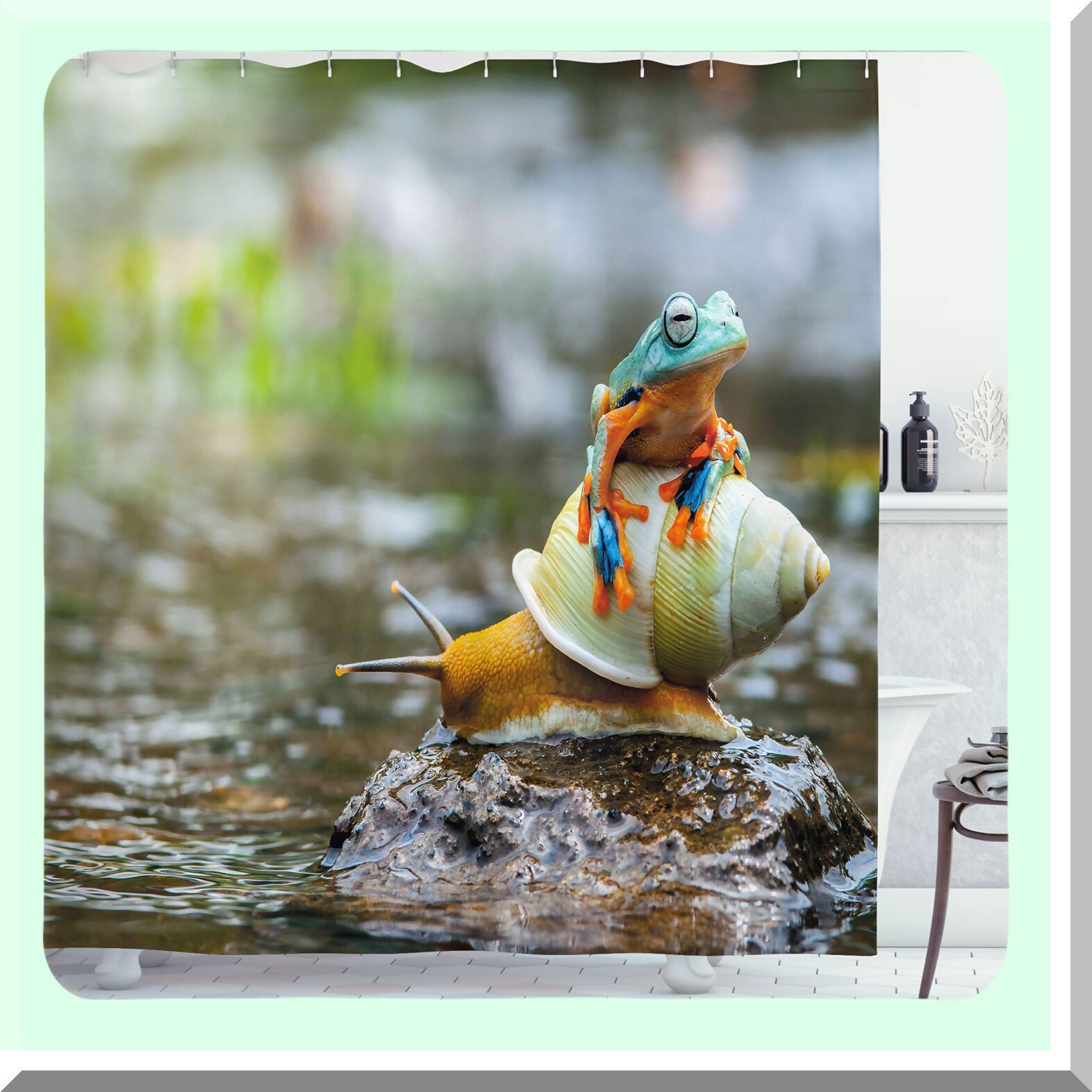 Transform your bathroom with this vibrant shower curtain featuring a colorful frog above a snail riverscape. Crafted from durable cloth fabric, it measures 69 inches wide by 70 inches long, providing ample coverage. The high-resolution digital printing creates a realistic, 3D-like appearance, adding depth and visual interest to your space. Its multicolor earth yellow palette complements various bathroom accessories such as towels, rugs, and mats, making it easy to coordinate your decor. Water-resistant and quick-drying, this curtain is practical for everyday use. The set includes hooks for easy installation, allowing you to refresh your bathroom's look effortlessly. Perfect for personal use or as a thoughtful gift, it suits a variety of tastes and interests. Whether you want to evoke a seaside vibe, mountain landscape, or playful aquatic scene, this curtain offers a unique and authentic touch to your bathroom environment. Manual measurement may result in slight discrepancies.