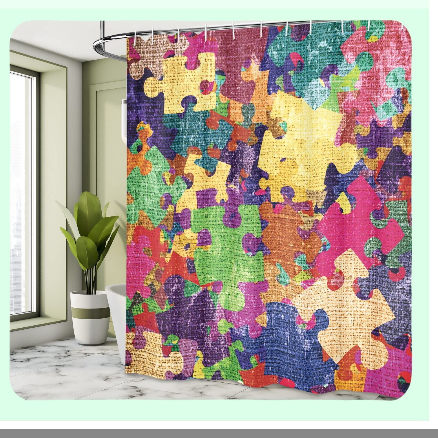 Transform your bathroom with this vibrant shower curtain featuring a grunge illustration combined with colorful jigsaw puzzles and stationery design print. Measuring 69 inches wide by 70 inches long, it offers a perfect fit for most showers. Crafted from cloth fabric, this decor set includes hooks for easy installation. The high-resolution digital printing creates a realistic, 3D-like appearance, enhancing your space with depth and color. Its water-resistant material dries quickly after use, maintaining its vivid hues without fading. The curtain's balanced thickness ensures durability without being too thin or thick, making it a practical addition to any bathroom, powder room, or guest suite. Its lively design complements various color schemes of towels, rugs, and bathroom accessories, instantly refreshing your decor. Suitable for personal use or as a thoughtful gift, this curtain brings a touch of personality and style to your daily routine. Please allow slight measurement discrepancies due to manual measurement.
