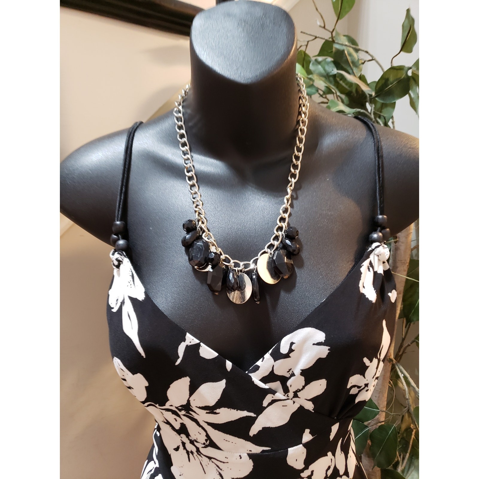 American Living Long Maxi Dress Women's 14 Black White Floral Spaghetti Strap