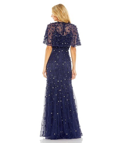 Mac Duggal 93653 Beaded Floral Appliqué Tulle Capelet Gown SZ 14 Midnight $698
