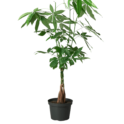 Botanical Name: Pachira aquaticaCommon Name(s): Guiana Chestnut, Money TreeDescription: Native to central and South America, the Money Tree is a braided tree that can grow up to 6-8 feet indoors or be trained as a bonsai. In east Asia, the Money Tree is often used by those who practice Feng Shui to bring positive "Chi", or energy, into the room, thus being a popular housewarming gift. On top of that, it is a hardy plant that requires relatively low maintenance. It can tolerate direct sunlight, but prefers bright indirect light, lots of water, and warm temperatures.