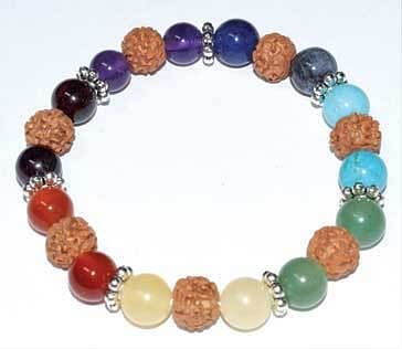Powerful 7 Chakra bracelet spaced with Rudraksha beads. Rudraksha beads are made up of seeds and used as prayer beads in Hinduism, carrying the energy of calmness, lowering blood pressure, and calming to the nervous system. Each Chakra symbol has a coordinating stone to help keep your chakras clean and clear of any blocks. Amethyst, Blue Onyx, Turquoise, Green Aventurine, Yellow Calcite, Carnelian and Red Jasper. 8mm Beaded bracelet with silver toned flower spacers. Made in China.