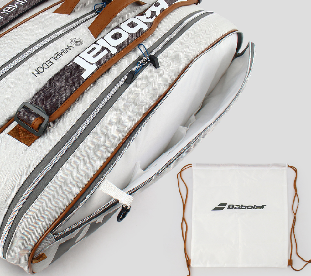 Main Features ---Brand : Babolat ---Gender : Unisex Adults ---Model : Babolat 2025 Pure Wimbledon 9RK Racket Bag / 751229 ---Color : White ---Material : Polyester 100% ---Dimension : 75 cm (W) x 42 cm (H) x 32 cm (D) / 29.5" x 16.5" x 12.6" inches (73L) ---Features : The 2025 RHx9 PURE WIMBLEDON is a triple-compartment racket bag designed with elegance and structure, made specifically to help serious players organize their gear efficiently. It can hold up to 9 tennis rackets. This bag features three spacious compartments mdash; not only for rackets, but also for shoes, clothing, and other equipment. Two of the compartments are insulated to protect your strings and gear from changes in temperature and humidity. A separate ventilated shoe compartment ensures hygienic and tidy storage of footwear. With adjustable padded shoulder straps, the bag can be worn like a backpack or carried by hand, thanks to its versatile 2-way carrying system and easy-to-grip handles. Made with durable and eco-friendly recycled PET material, this bag offers excellent resistance and sustainability for long-term use. The 2025 RHx9 PURE WIMBLEDON is a triple-compartment racket bag designed with elegance and structure, made specifically to help serious players organize their gear efficiently. It can hold up to 9 tennis rackets. This bag features three spacious compartments mdash; not only for rackets, but also for shoes, clothing, and other equipment. Two of the compartments are insulated to protect your strings and gear from changes in temperature and humidity. A separate ventilated shoe compartment ensures hygienic and tidy storage of footwear. With adjustable padded shoulder straps, the bag can be worn like a backpack or carried by hand, thanks to its versatile 2-way carrying system and easy-to-grip handles. Made with durable and eco-friendly recycled PET material, this bag offers excellent resistance and sustainability for long-term use.