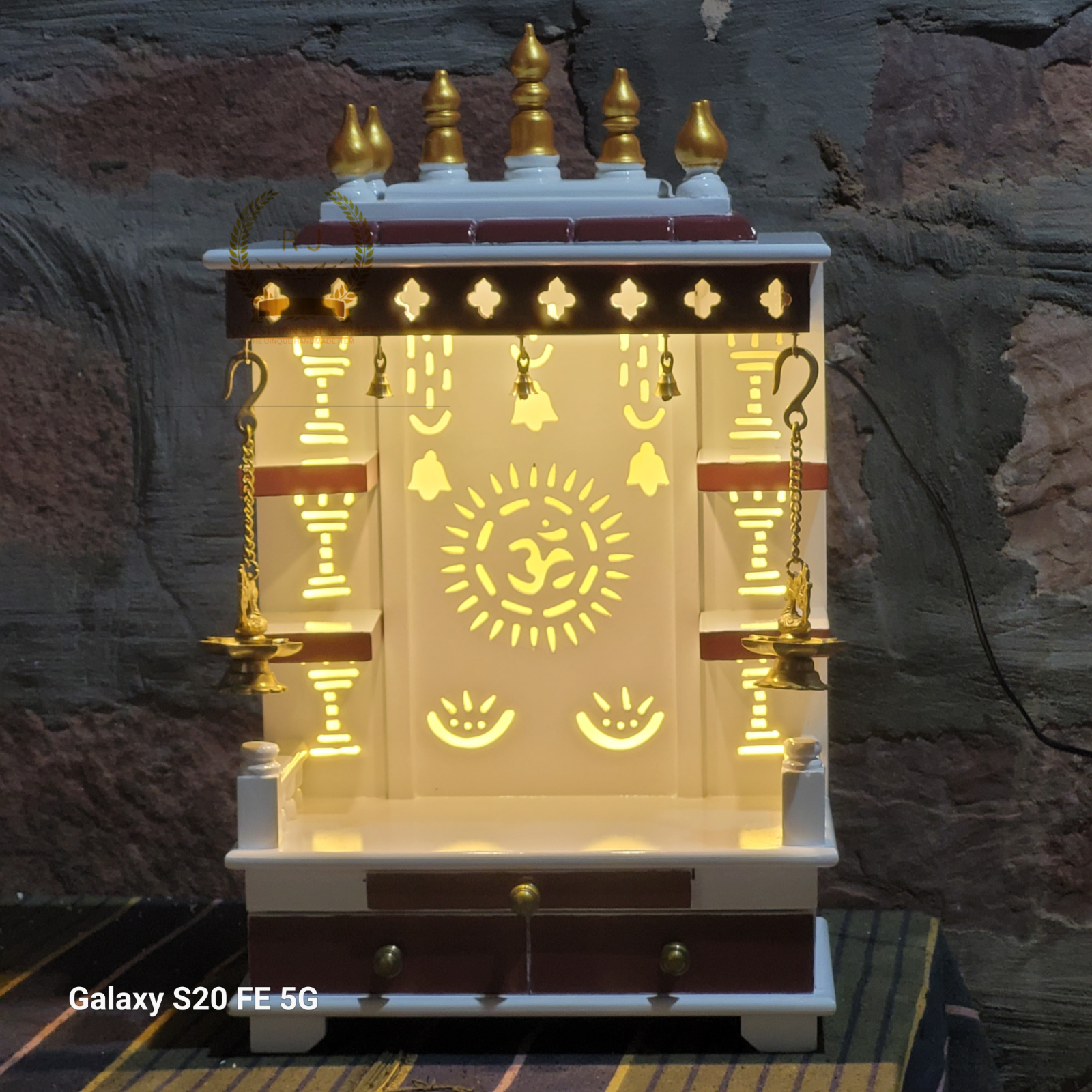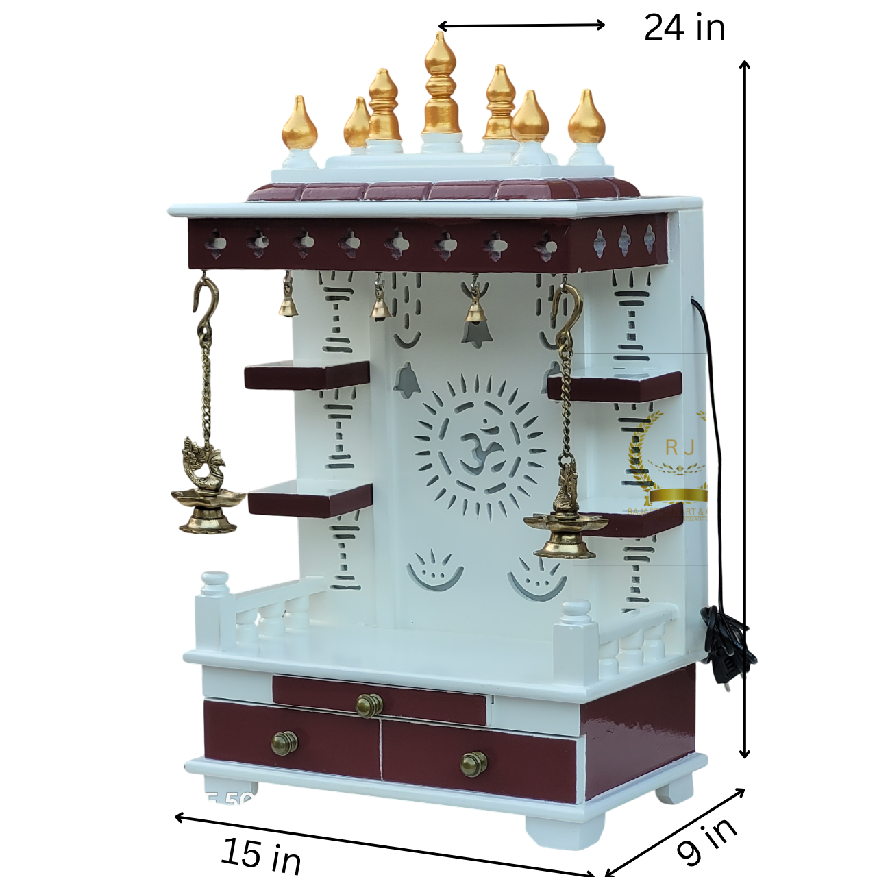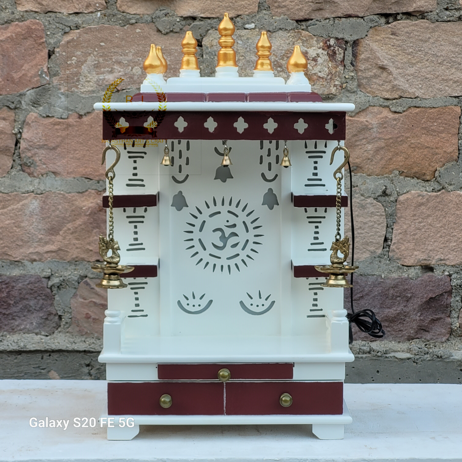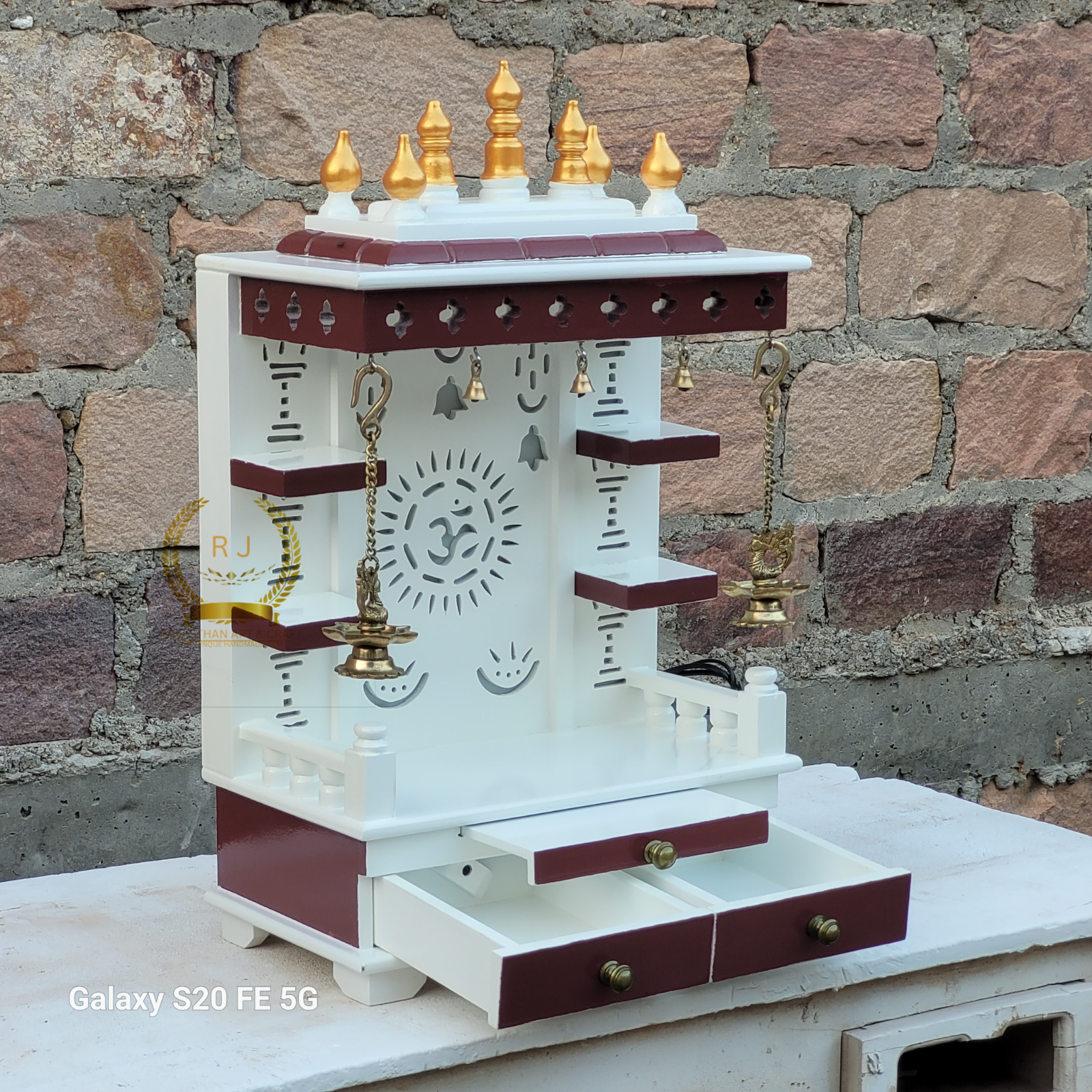 Wooden temple wood Open pooja temple White + Dark Red Paint Drawer and pooja shelf