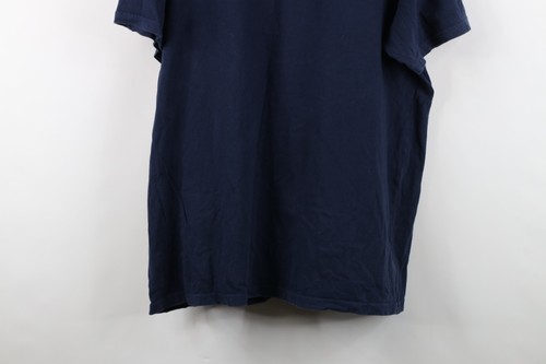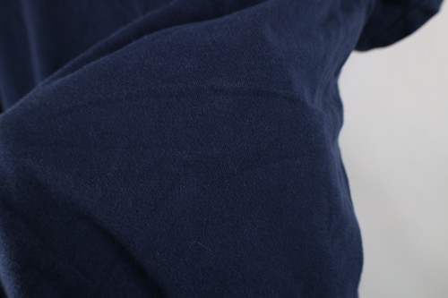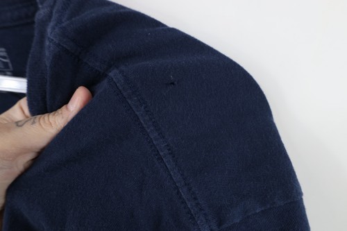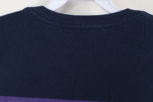 Blemishes front, back. Hole left shoulder. Collar, arms discolored. Graphics, color faded. Pilling. Made in USA