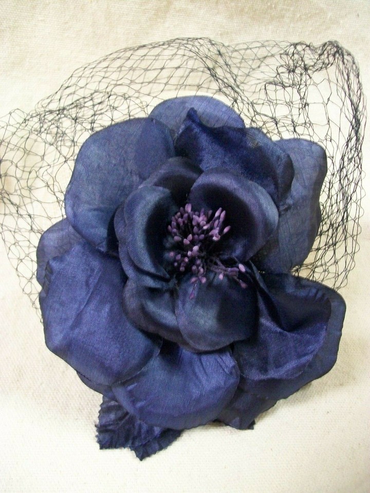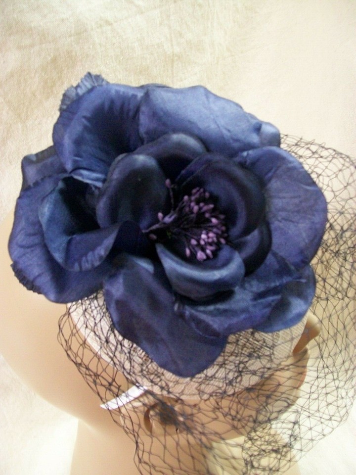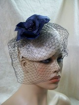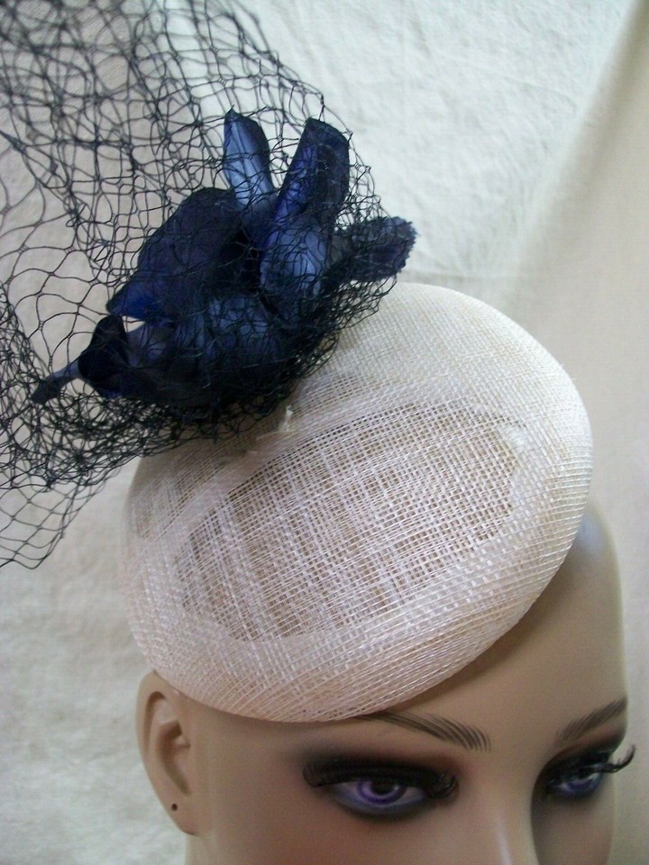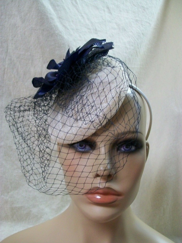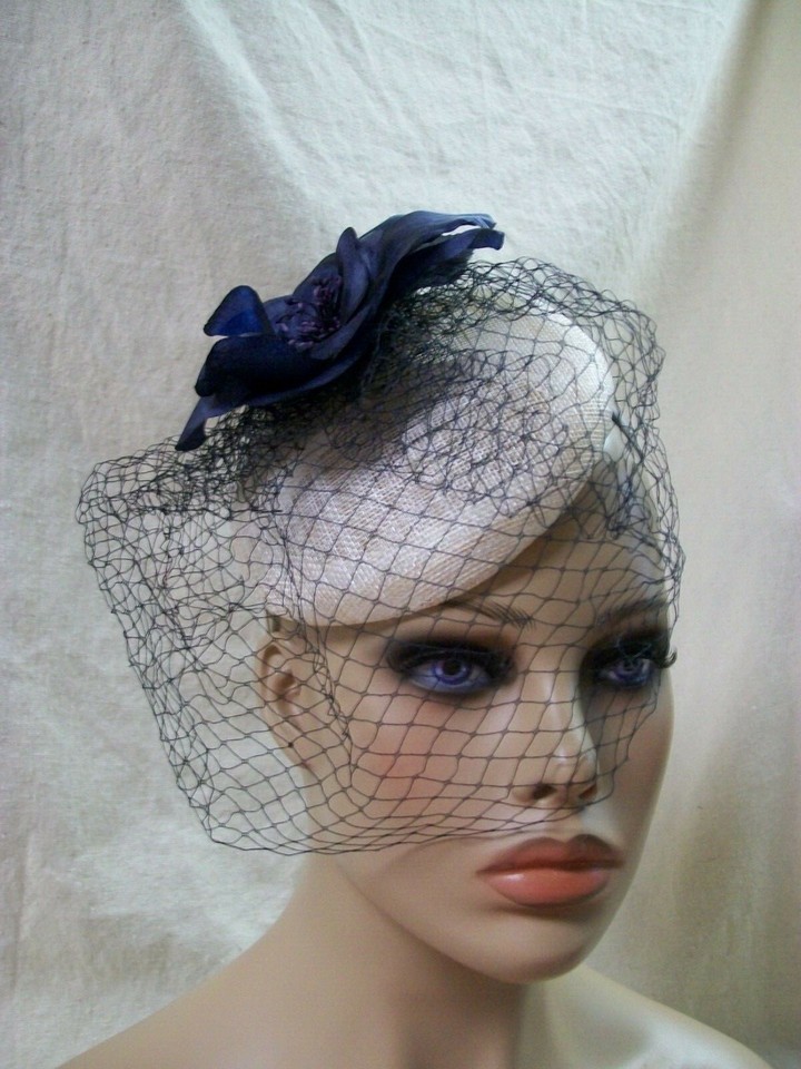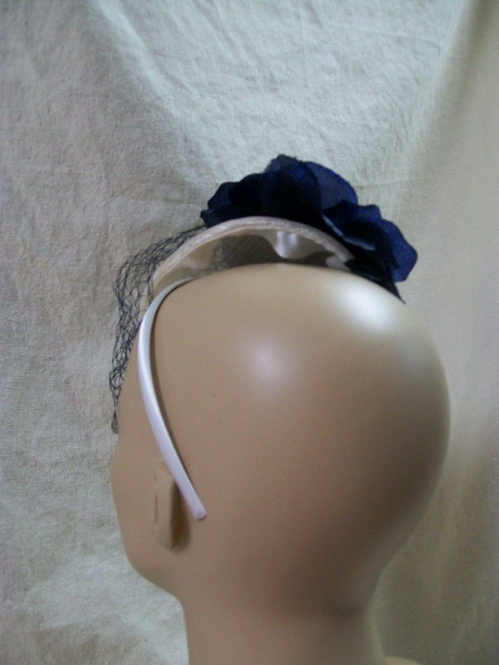 Retro inspired Hat. Beige Mesh hat form attached to a headband with a dark blue flower and veil. Veil is very dark, I'm not sure if its black or just a really dark navy blue. DOES NOT INCLUDE MANNEQUIN OR OTHER ACCESSORIES.