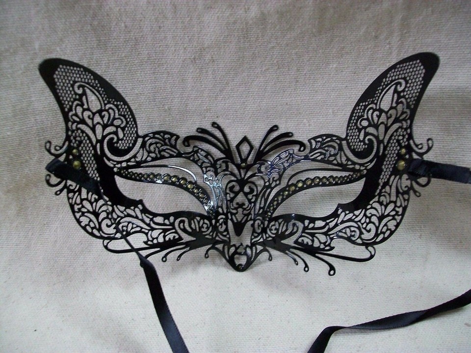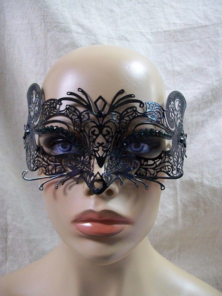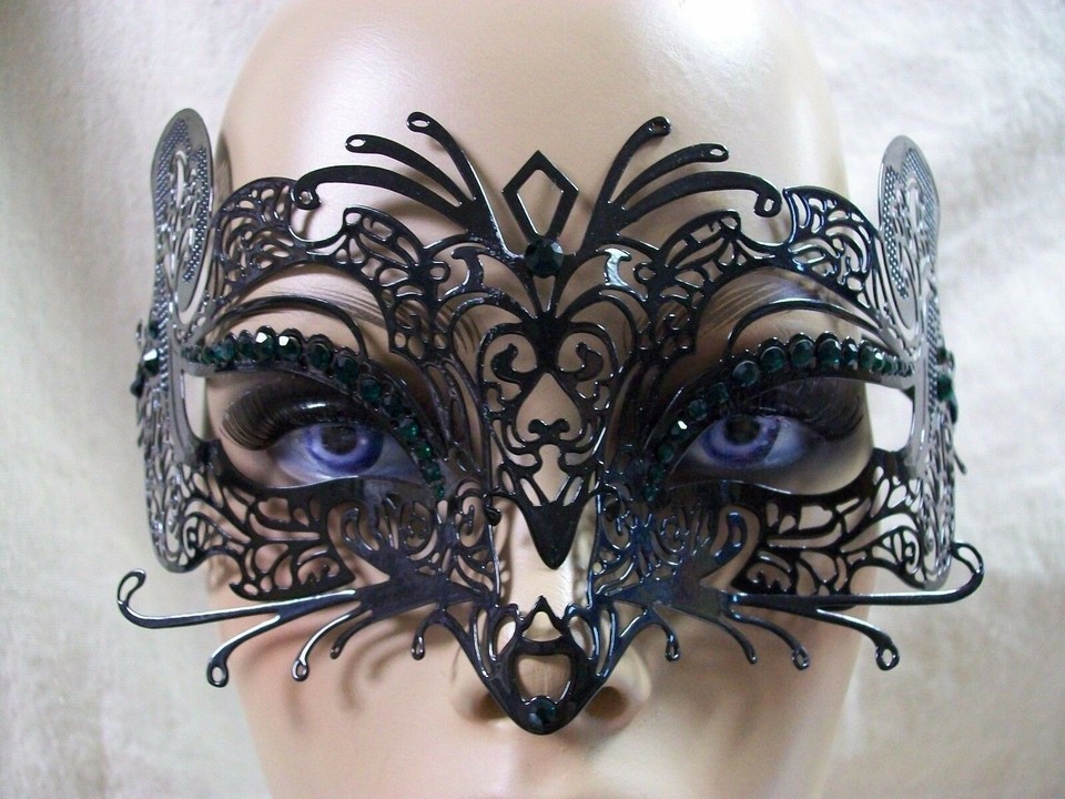 Baroque Renaissance Venetian or Masquerade Costume eye mask. Fancy Black Metal mask Gothic Cat face shape with dark green stones. Metal may need gentle shaping / bending. Has fabric ties on the sides to tie mask on. Covers only eye area of the face. This type of mask is great for parties because it is easy to wear while talking, eating, or drinking. One Size Fits Most. No Tags. No age specs, most costume items are for ages 14 and up.