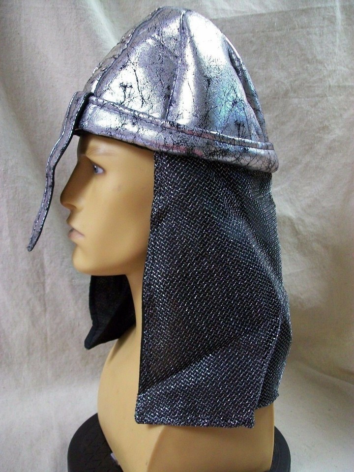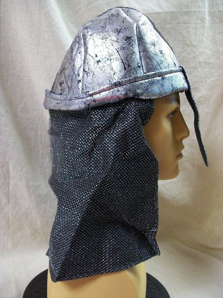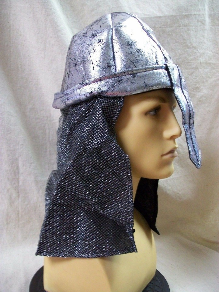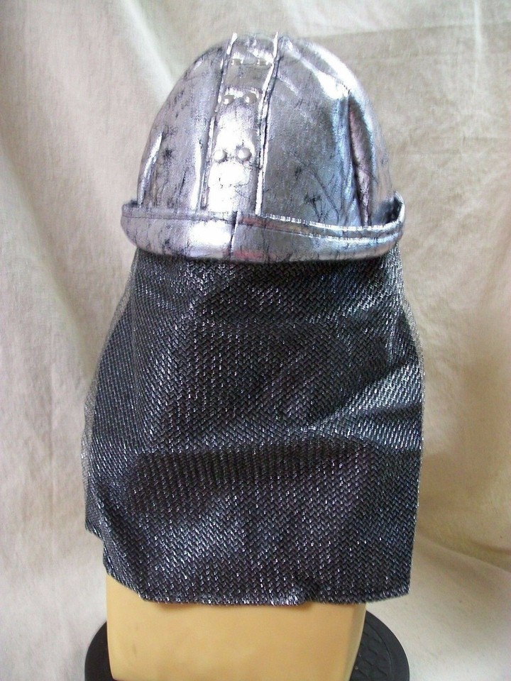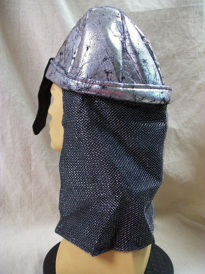 Black Silver distressed look. Fake Chainmail. Flap in front like nose guard. Flap is big and hangs down kinda far. It looks out of proportion for the hat and could be tucked in out of the way. Extended part from cap is a silver fabric mesh. Made to imitate Chain Maille Knight Armour. One Size Fits Most. No age specs. Most costume items are for ages 14 and up. Lightweight Fabric Construction.
