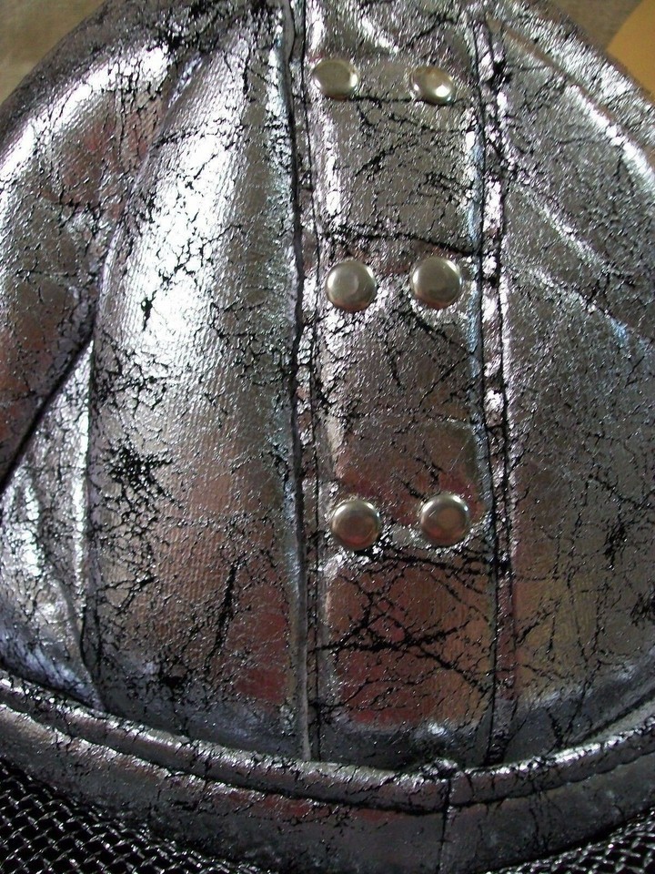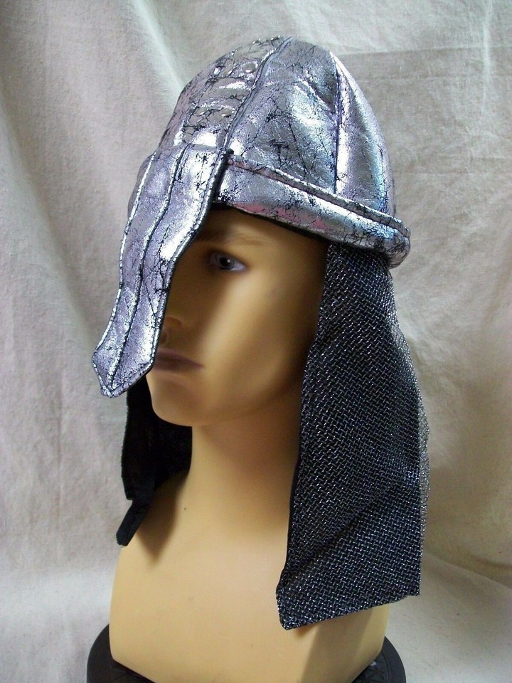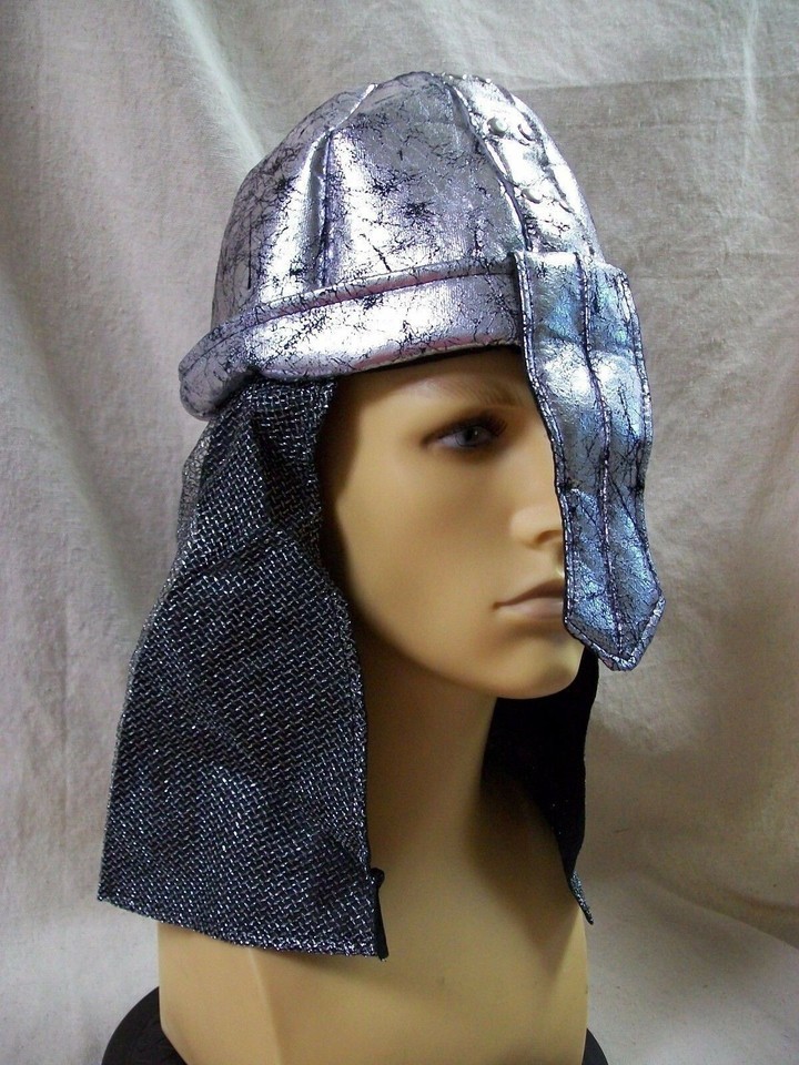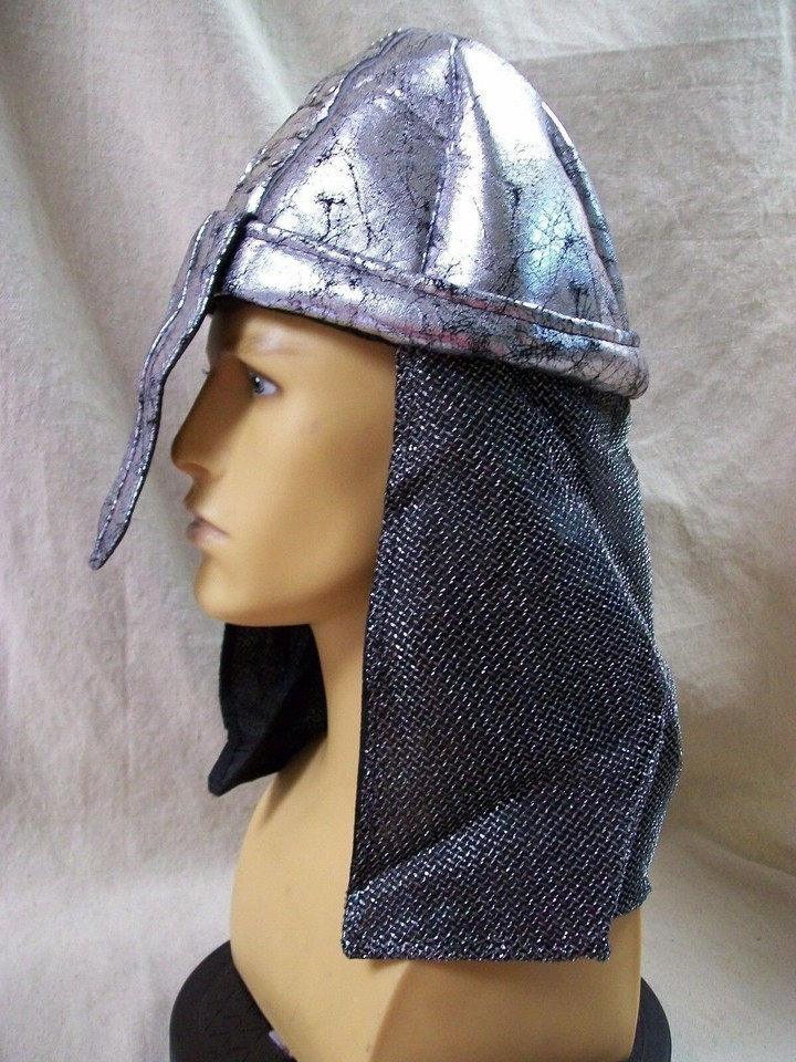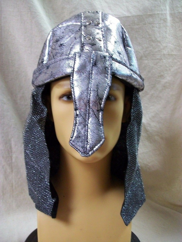 Black Silver distressed look. Fake Chainmail. Flap in front like nose guard. Flap is big and hangs down kinda far. It looks out of proportion for the hat and could be tucked in out of the way. Extended part from cap is a silver fabric mesh. Made to imitate Chain Maille Knight Armour. One Size Fits Most. No age specs. Most costume items are for ages 14 and up. Lightweight Fabric Construction.