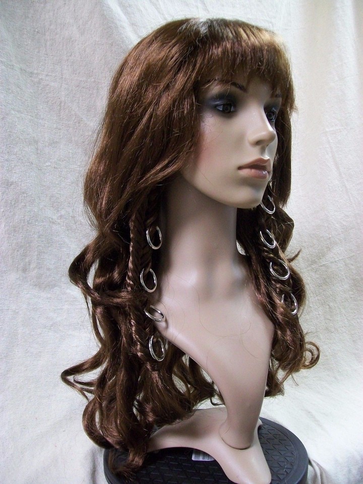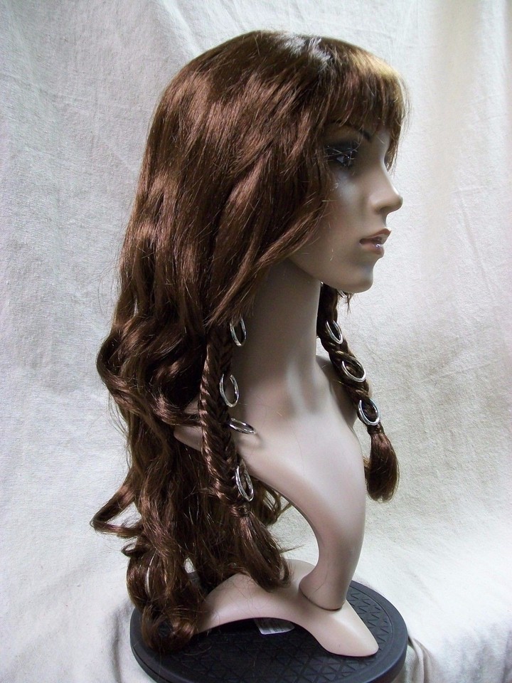 Warrior Queen Costume Wig. Mixed Layers. Shaggy Cut Bangs. Fiber is sorta coarse. Fishtail Braids, one on each side with silver rings randomly through them. This is a heavier wig and may become uncomfortable after prolonged wear for those with neck issues.