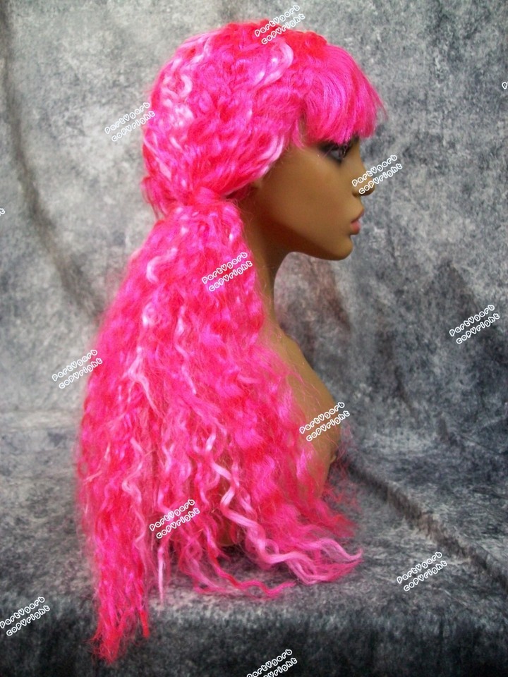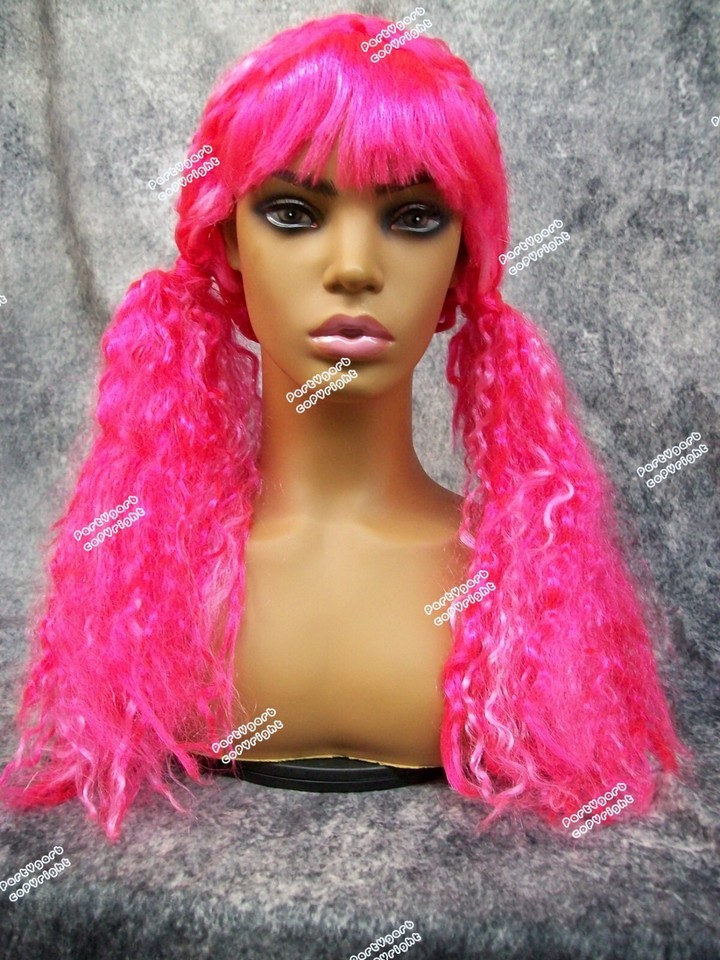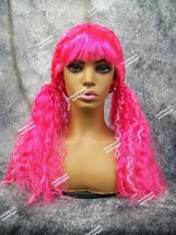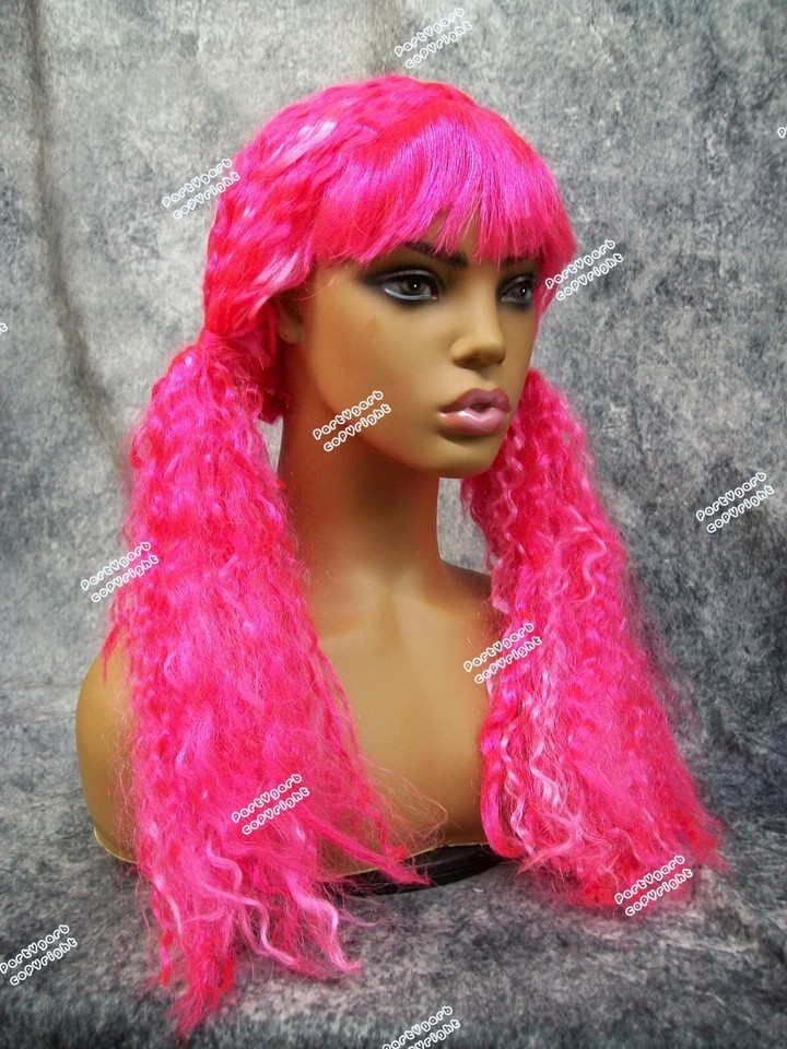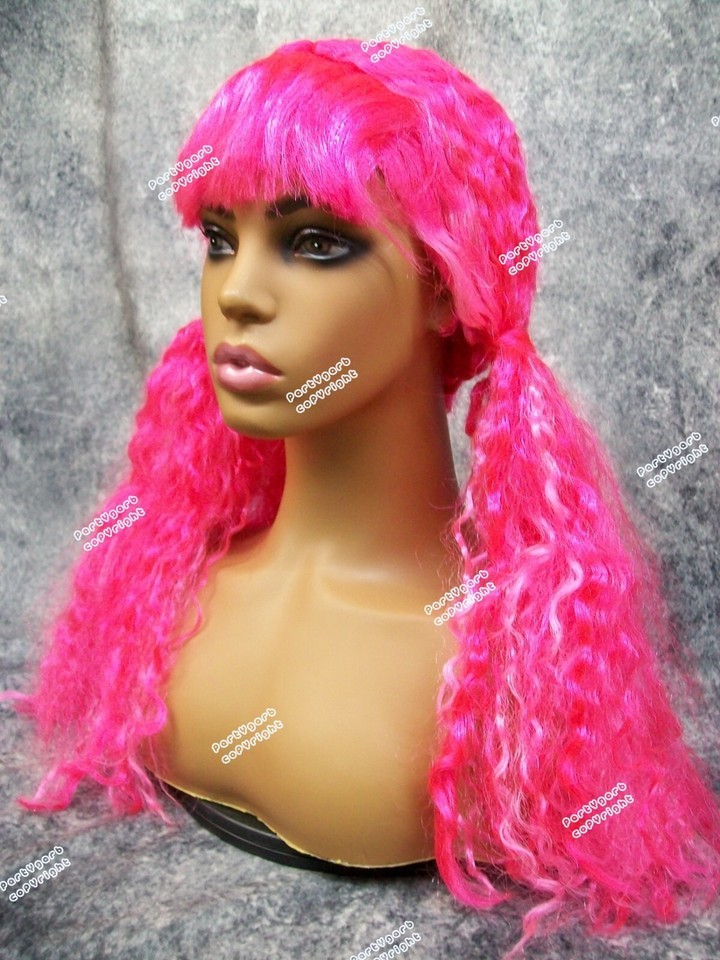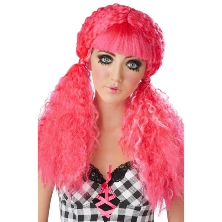 Hot Pink Crimped Doll Wig Parted Pigtails Bangs Circus Punk Bo Peep Rave Party