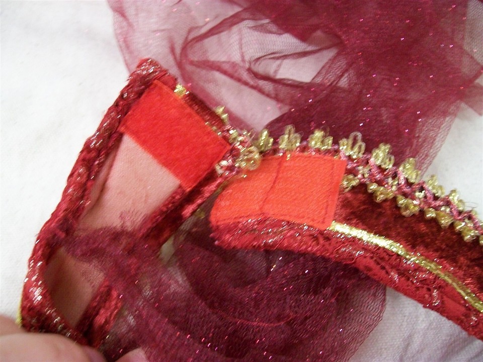 Red with Gold Accents. Has Red Glittery Tulle like veil. Does Shed some glitter. Veil can be worn trailing from back or pulled over front. Velcro tabs for closure. Foam back fabric veil part is folded in package and slightly out of shape. May need some relaxing or shaping before wear. Child: One size fits Most. Not intended for ages under 3. May also fits some teens and smaller adults. DOES NOT INCLUDE MANNEQUIN..
