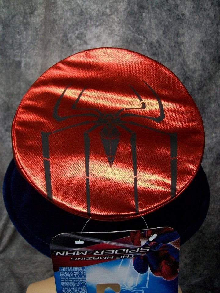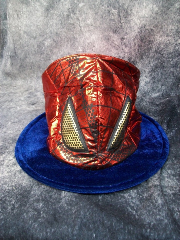 Spiderman Costume Themed Top Hat. The hat leans towards the back. No access in the lining to add stuffing. Eyes look on the front and spider print on the top. Has a size adjuster in interior band. Metallic Fabric part scratches easily and shows some scuffs. SOLD AS IS. The blue on the rim is a velveteen like material and it picks up lint easily. Ships collapsed. DOES NOT INCLUDE MANNEQUIN OR OTHER ACCESSORIES IF SHOWN. Not for ages under 3. Since this is a larger hat I would recommend for adults and teens.