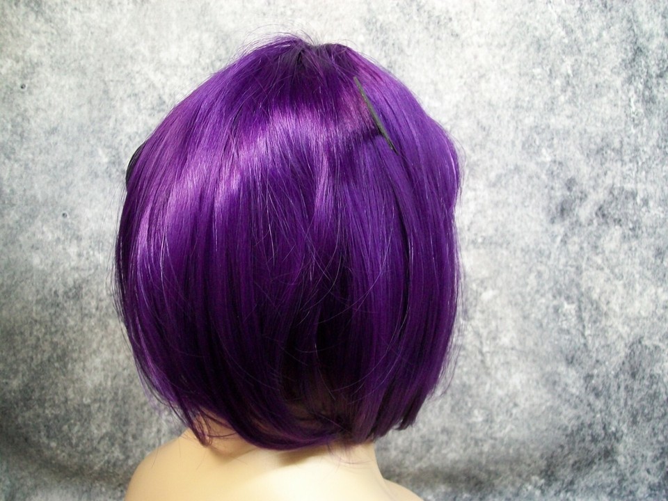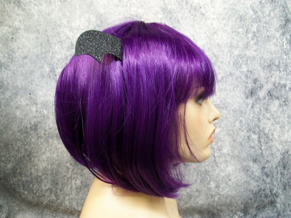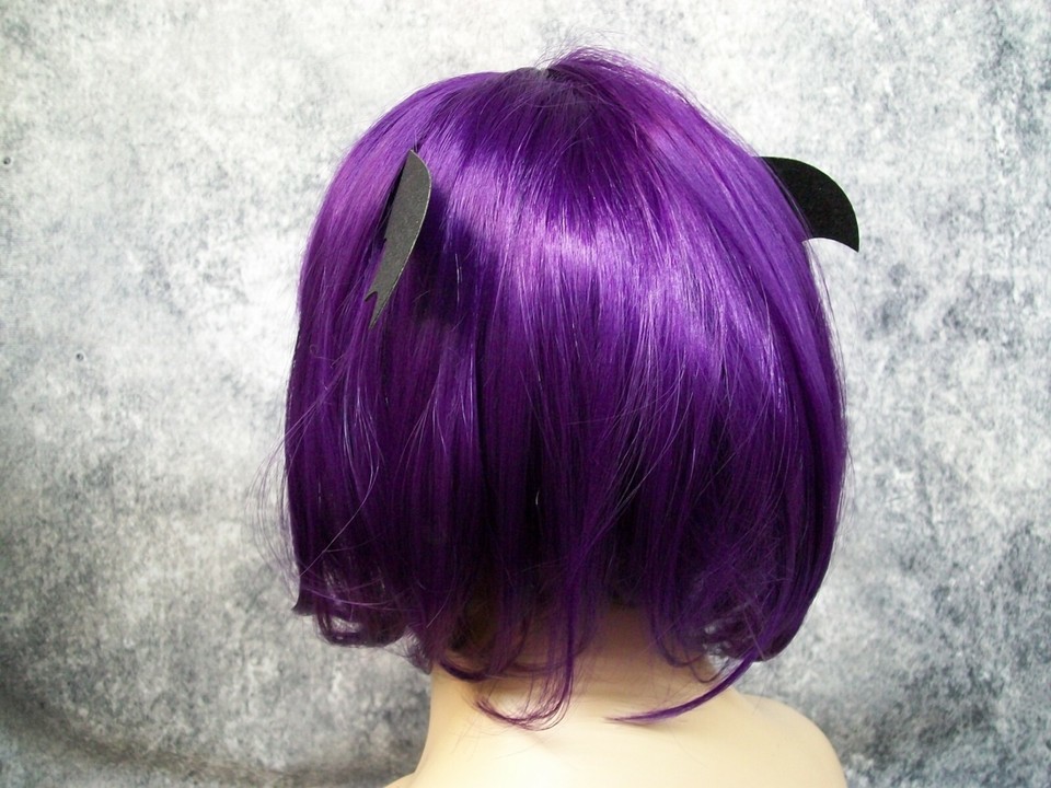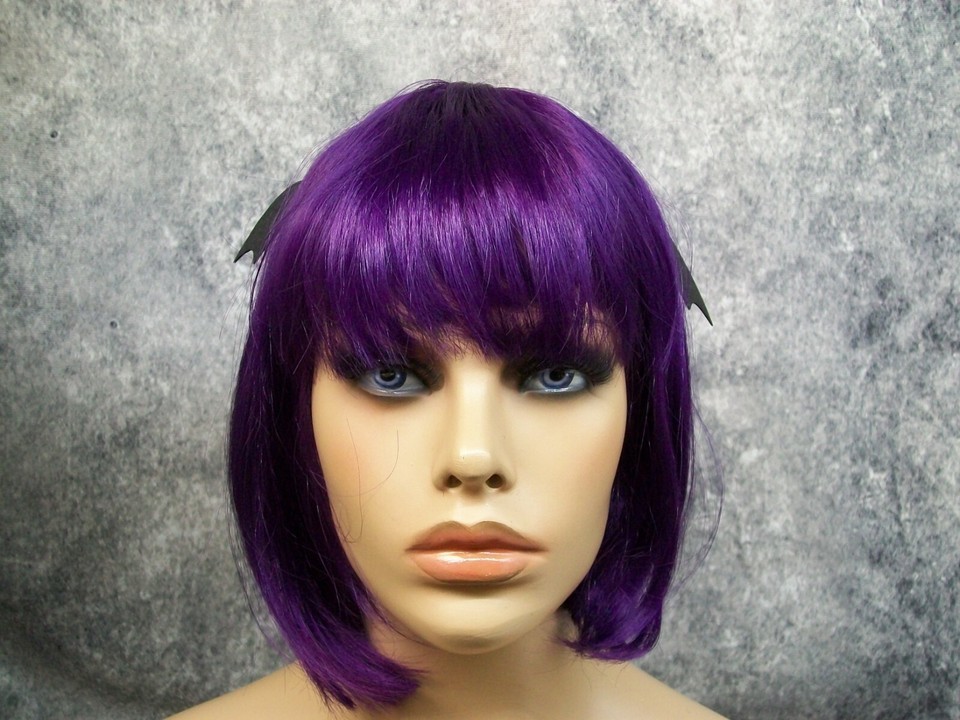 Bat Wing themed costume wig. Bat wings look like a paper board type material. Adult: One Size fits most. This is a shorter style and may not wear well by those with long thick natural hair. Messy Bob - Could use some trimming to tidy it up. One side seems fuller / longer than the other. Shaggy undercut bob. Not heat resistant. Expect Shedding. Adjust fiber to conceal net on cap.