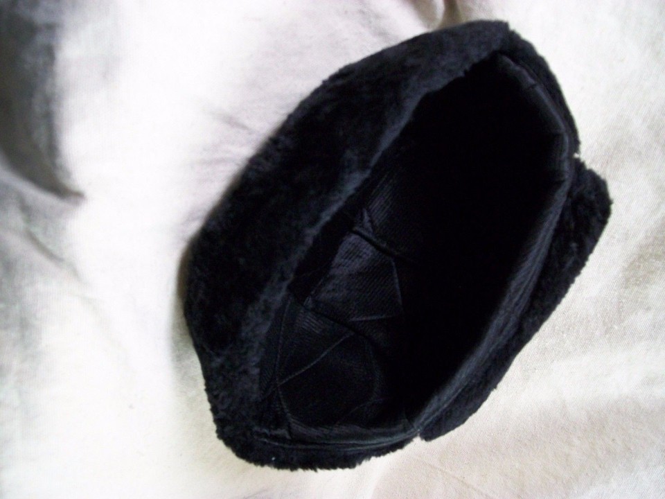 Trooper Costume Hat. Black with Black lining and Black Faux Fur Plush on the flaps. Can be with flaps up or down. 3 snaps on the side straps. Tag says 100% Vinyl Synthetic Wool. Dry Clean Only. One size fits most. For Ages 14 and up. Great accessory for: Fargo Police Officer, Detective, Aviator, Elmer Fudd, Wabbit Hunter, Dwarf, Miner, Trapper, Hunter, Mountain Man, Fur Trader, Frontiersman, Hillbilly, etc. DOES NOT INCLUDE MANNEQUIN.