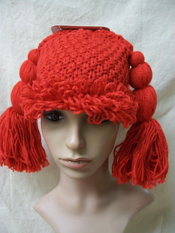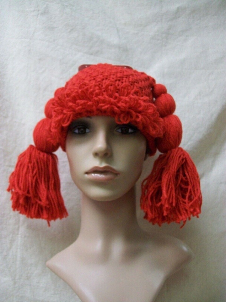 Red Yarn Rag Doll Girl Crochet Beanie Hat Pigtails Raggedy Ann Cabbage Patch Kid