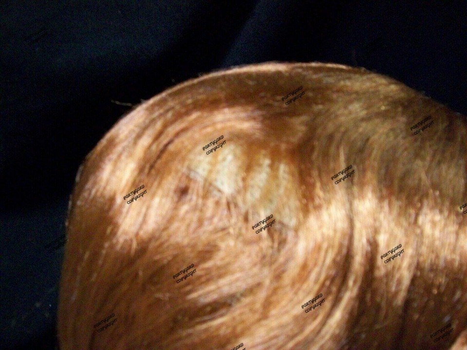 Adult Lady Guinevere Costume Wig. Parted Style has Two small Braids (Plaits) on each side pulled from the front and gathered in the back. Supposed to be Auburn but it is more of a lighter natural red. Hair is coarse and frizzy towards the ends. Finger comb only to prevent separating the fiber too much. Expect shedding. Shorter filler hair is visible near front and braids will require adjusting or tucking to keep from sticking out. Part is not straight. Fiber needs adjust over cap to conceal the netting. Not sure how color is going to be displayed on other screens. I tried different backgrounds and these photos looked the truest on my screen. Please keep in mind I have no way of knowing what you are seeing. Exact tones cannot be guaranteed. One size fits most. Adult Use.
