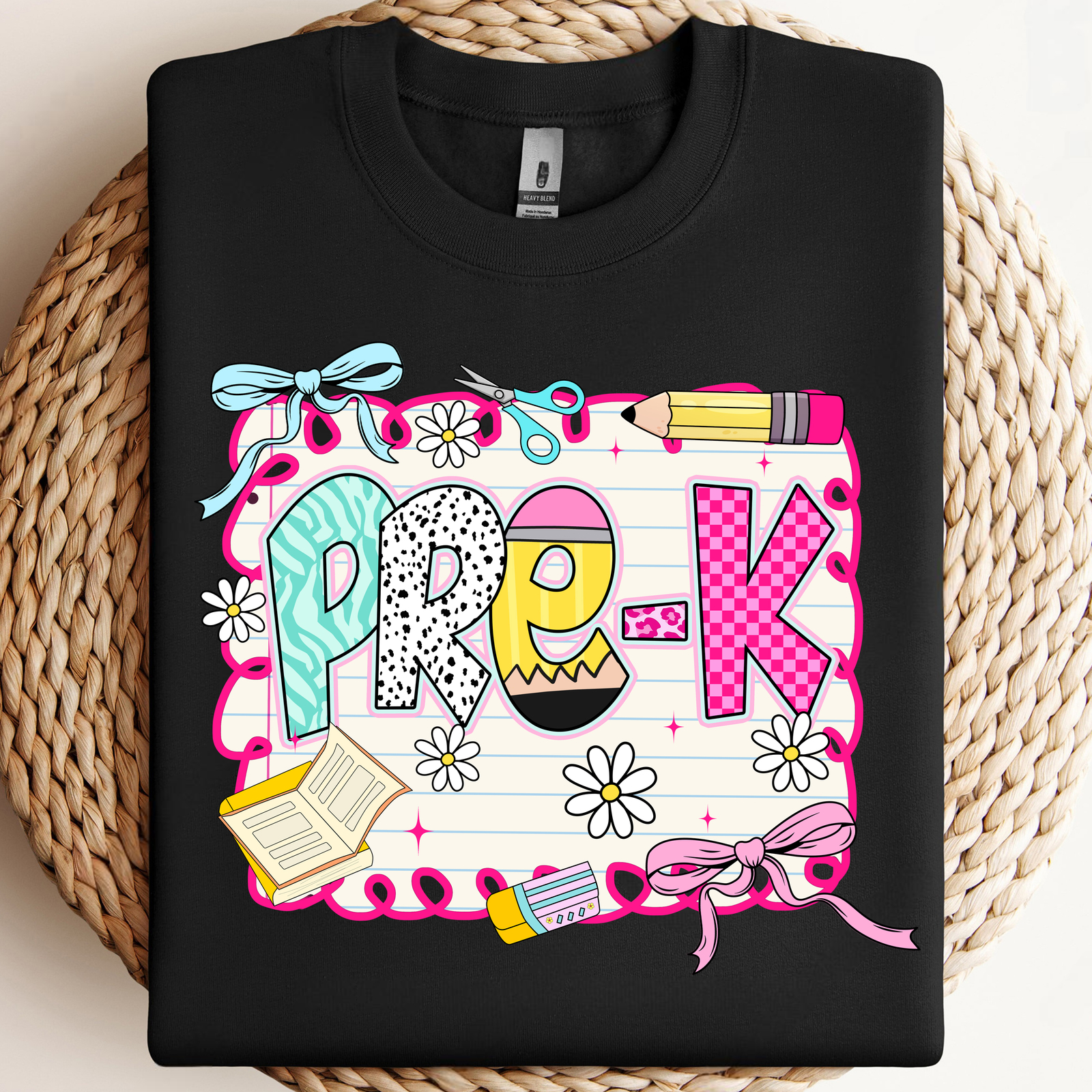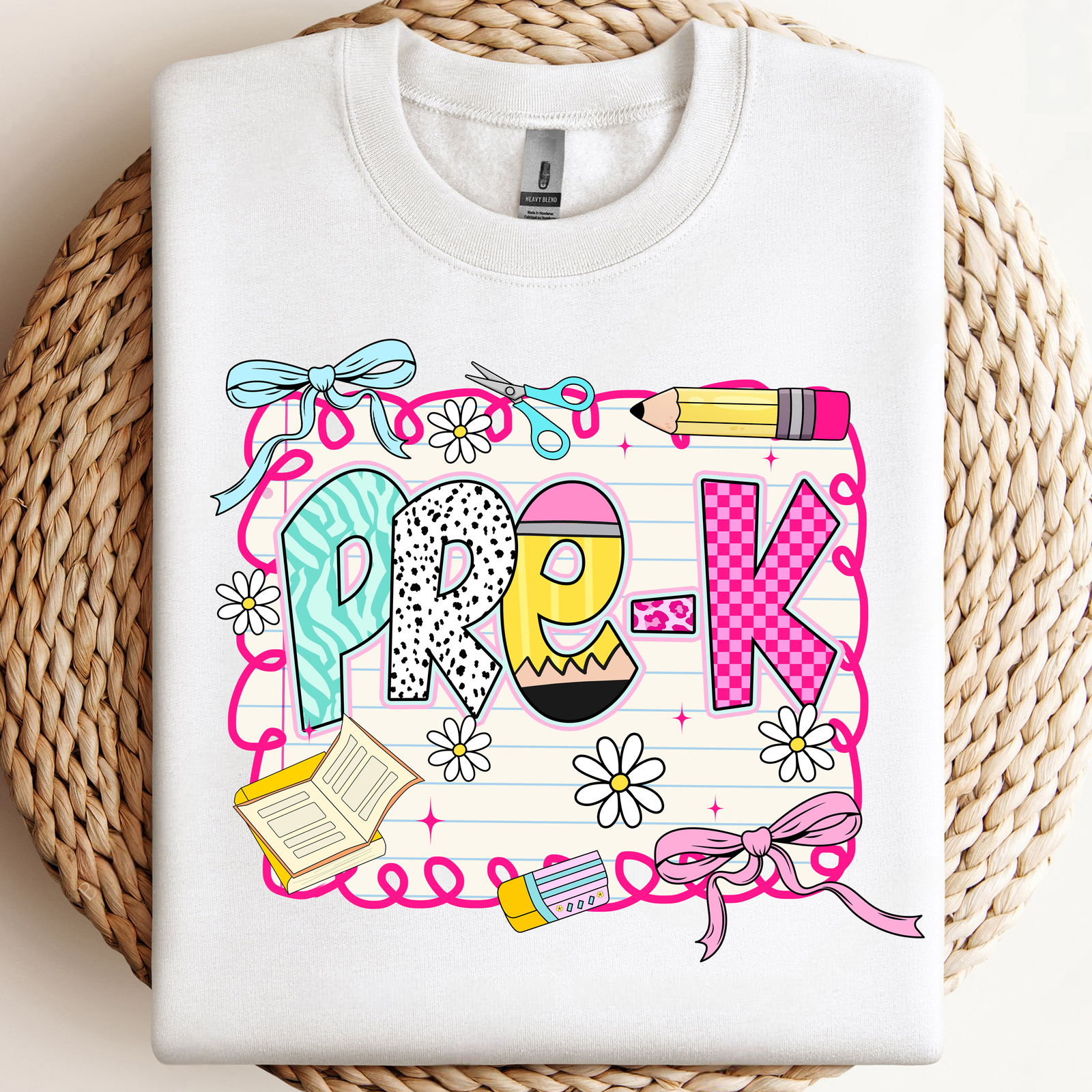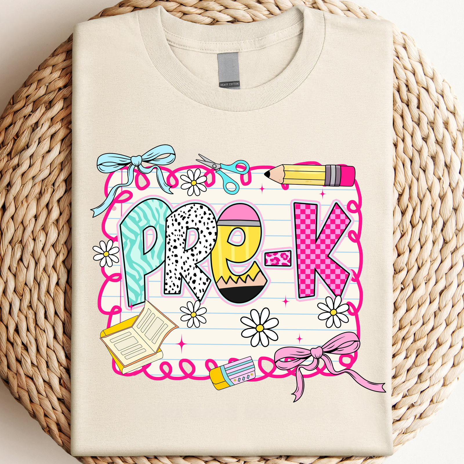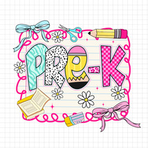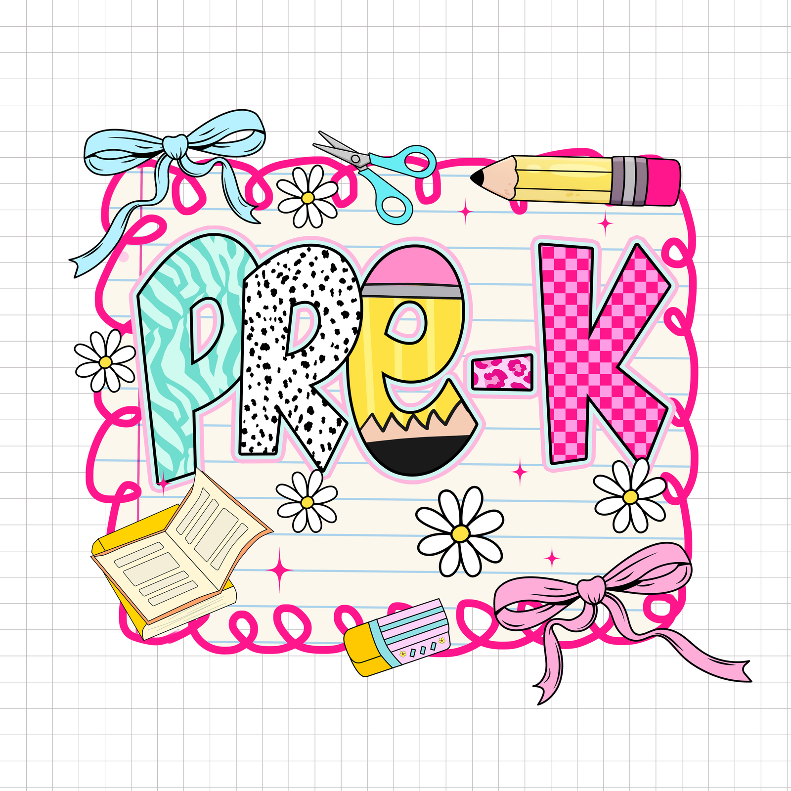 Pre-K Back to School PNG, Dalmatian Checker Pencil Doodle Bow, Preppy Teacher First Day of School Shirt Design, Pink Bow Pre-K Png, Trending Design