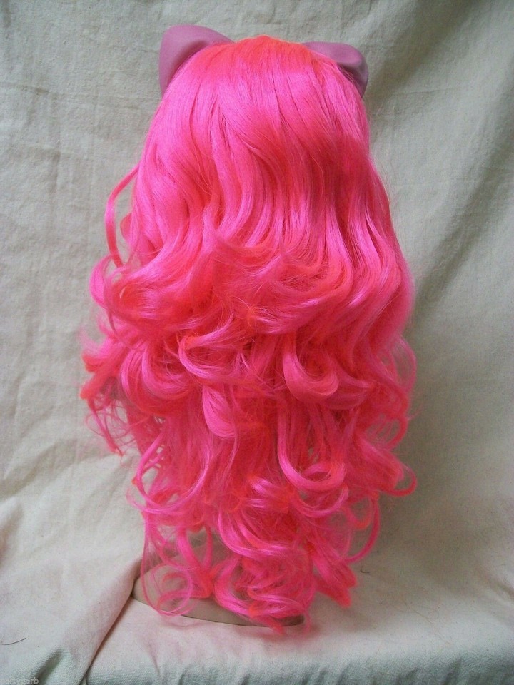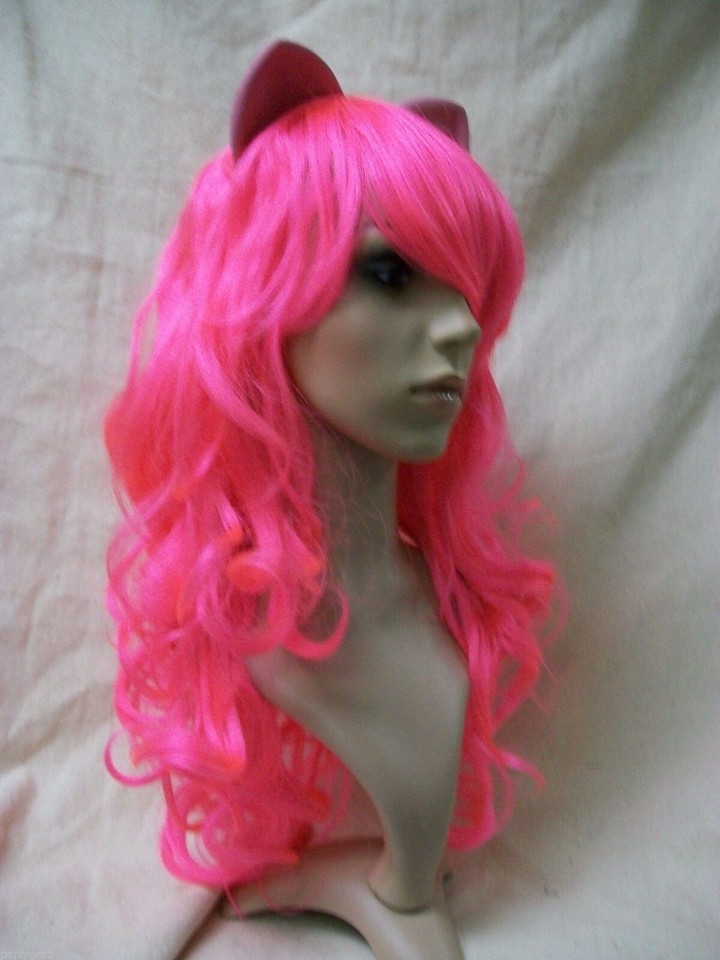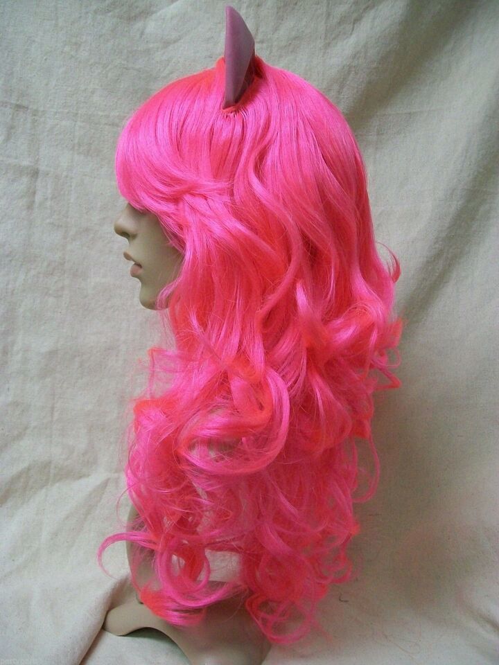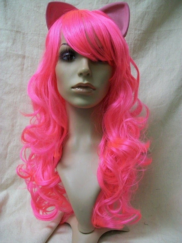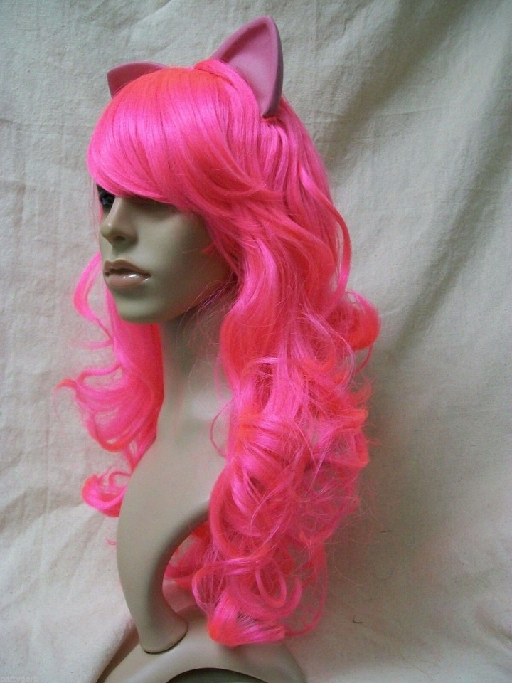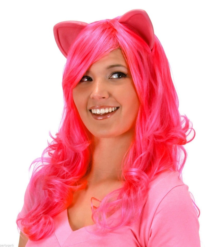 My Little Pony Pinkie Pie Character Costume Wig. Long wispy curly layers. Bangs are long and tend to be in face, if this is bothersome, you may use some hairspray. Has attached latex ears. The ears are flexible and seems to be hollow. Some of the ears are kinda wrinkled/dented, I think from being in the package. They should relax after they are out and free of package. However, if they don't bounce back to shape you can carefully warm them with low setting on hair dryer. Please be careful not to scorch ears or get to close to hair fiber as it will melt with heat. Or may try briefly placing in a warm sunny place. The ears are latex so beware if you have allergies to latex products. Recommended for Ages 14 and up. Could also be used for Pink Panther, Cheshire Cat, Kitty, Cosplay or Anime Costume.