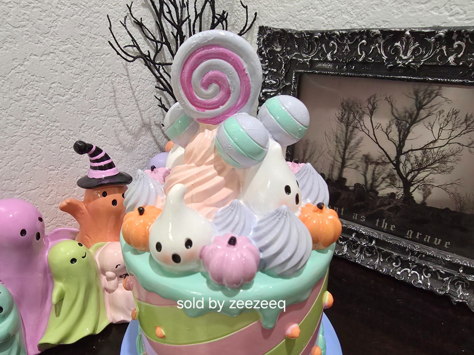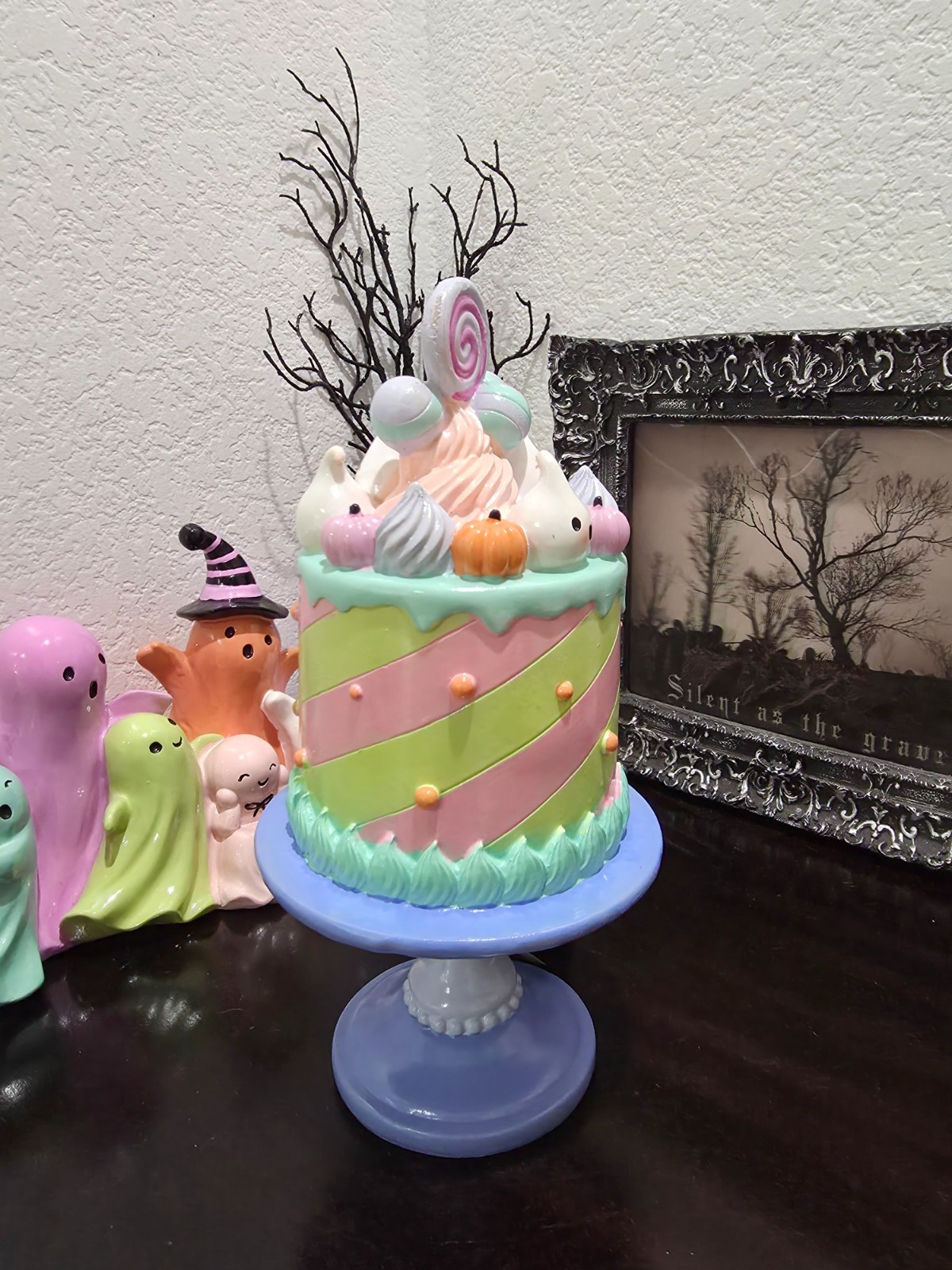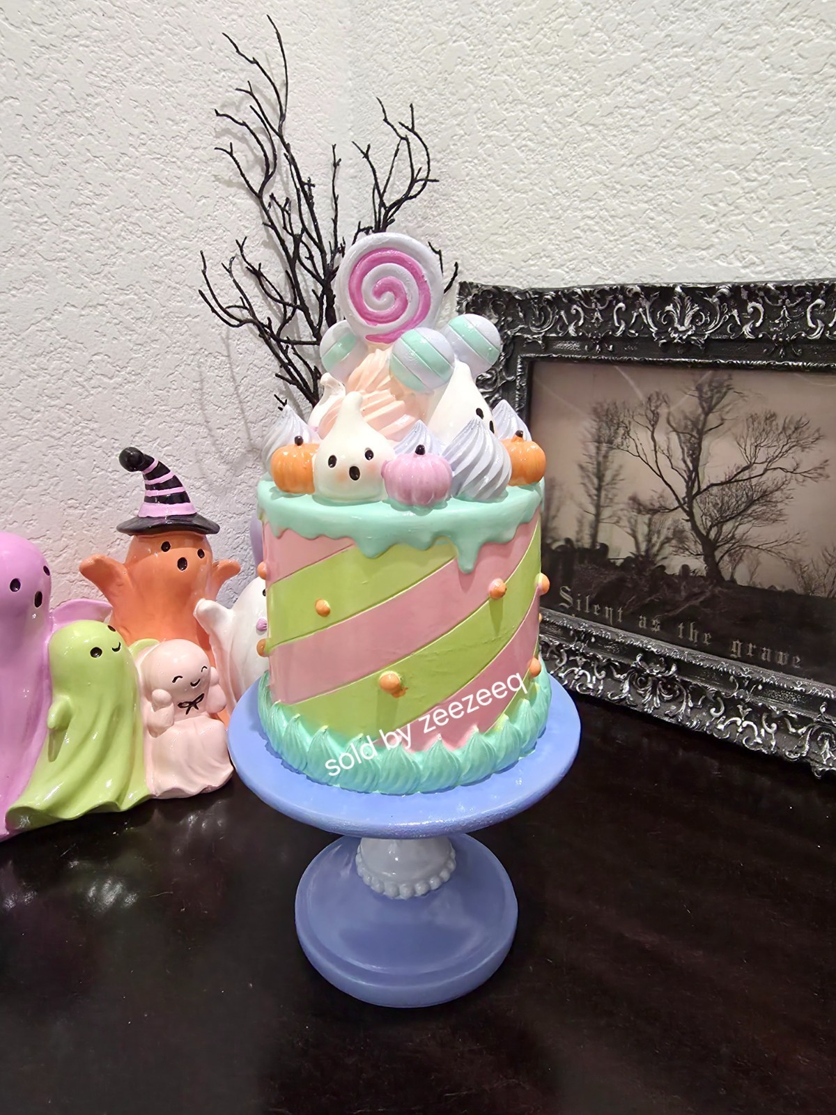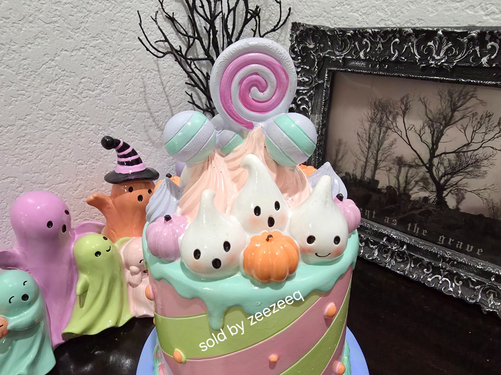 Up for sale we have this super cute pastel faux cake for your Halloween decor. The cake has ghost with pumpkins. Sooo cute! Made of resin. NEW