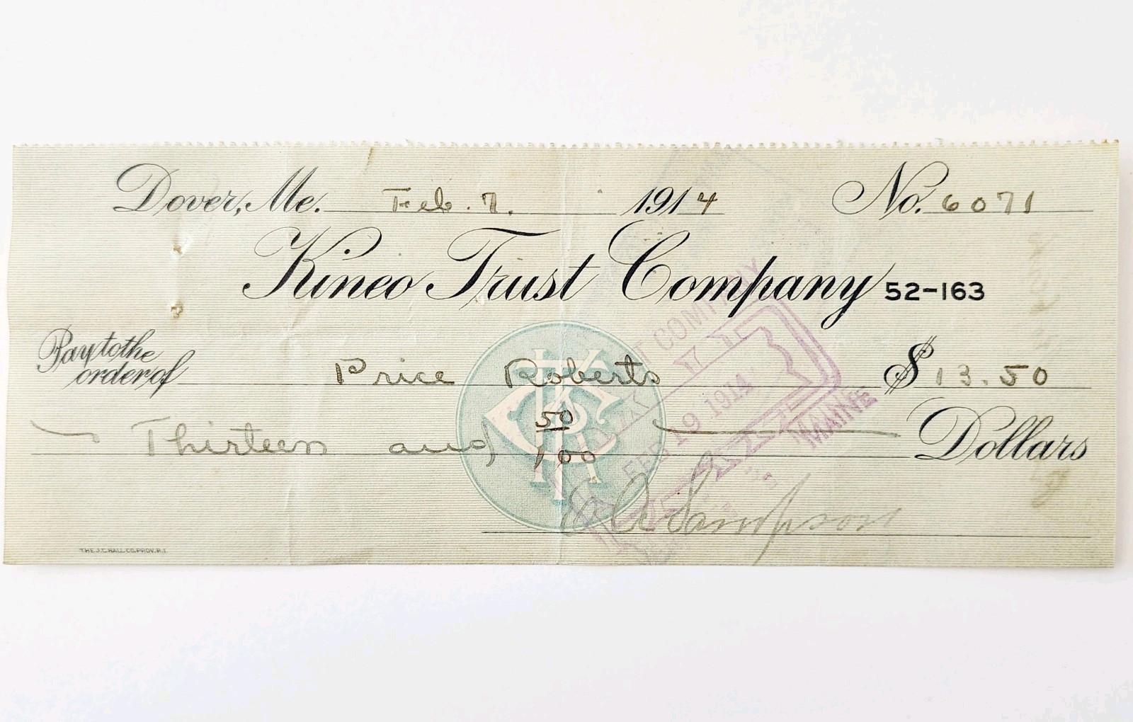 1914 Kineo Trust Company Bank Check E.A. Sampson Dover Maine Signed 6071 CHX8