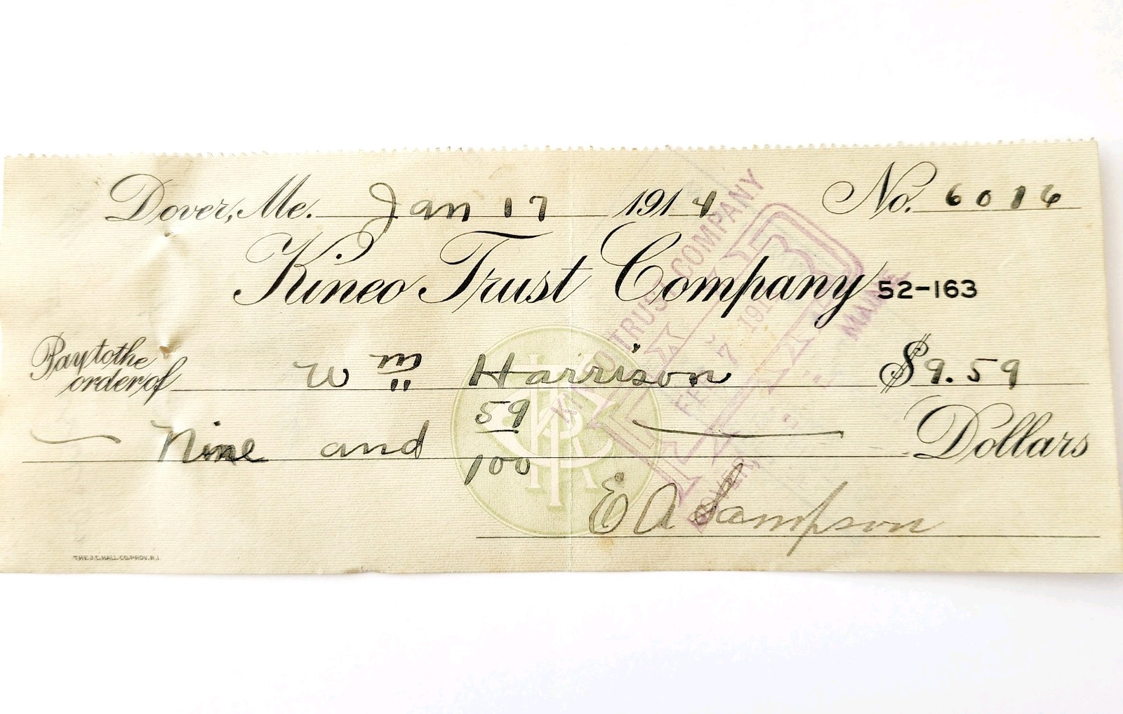 1914 Kineo Trust Company Bank Check E.A. Sampson Dover Maine Signed 6016 CHX7