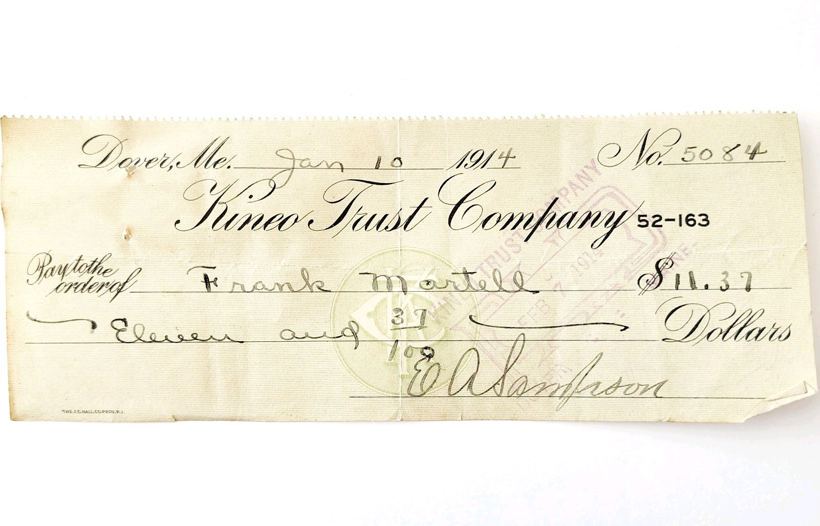 1914 Kineo Trust Company Bank Check E.A. Sampson Dover Maine Signed 5084 CHX7