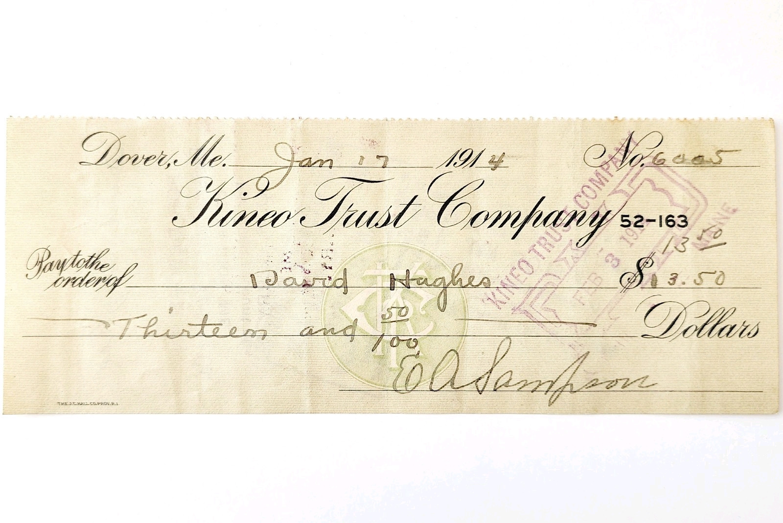 1914 Kineo Trust Company Bank Check E.A. Sampson Dover Maine Signed 6005 CHX8
