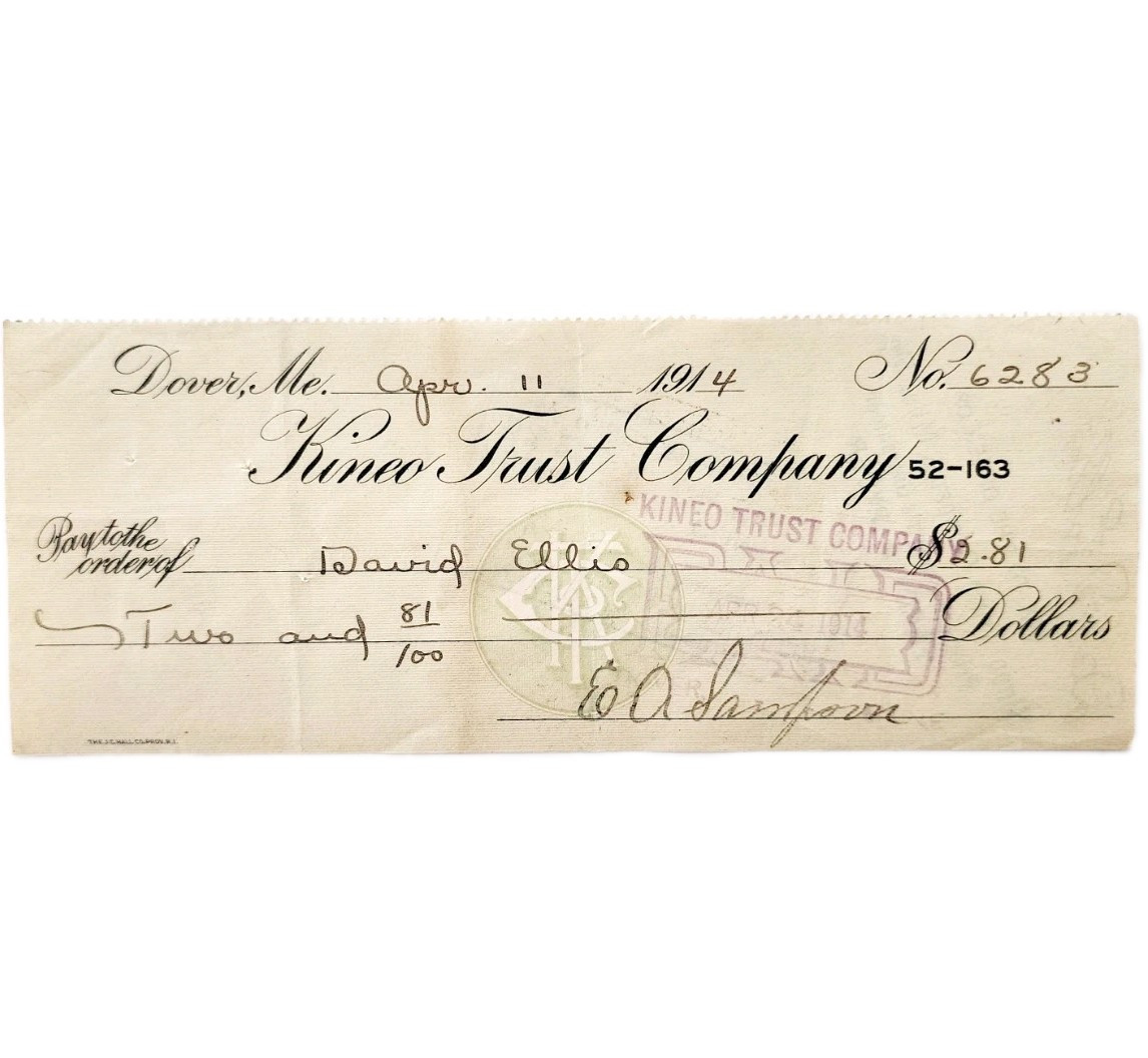 1914 Kineo Trust Company Bank Check E.A. Sampson Dover Maine Signed 6283 CHX11