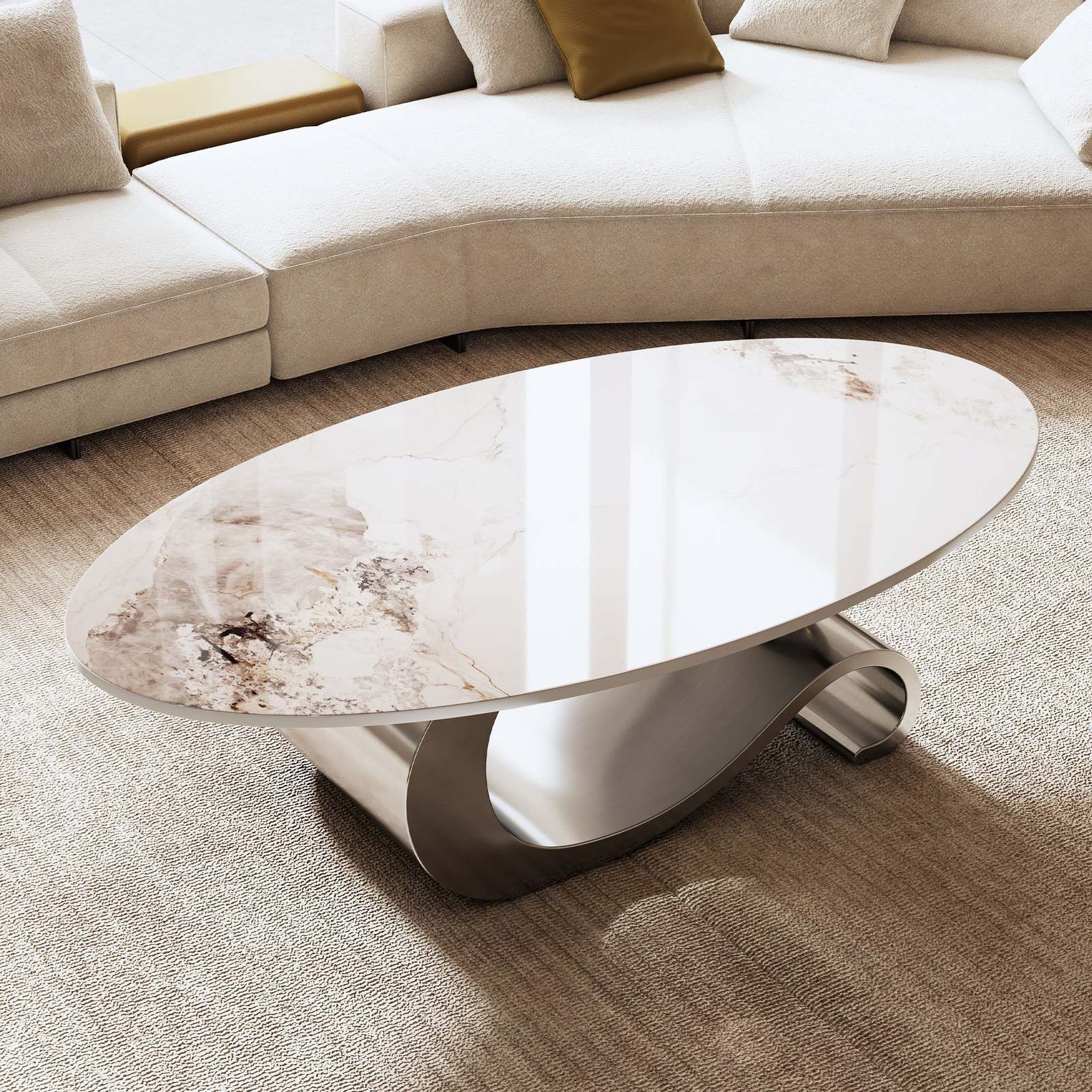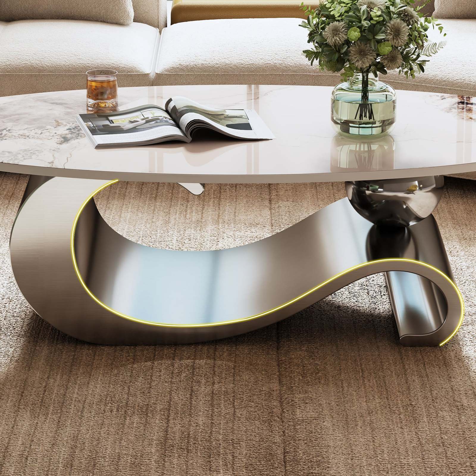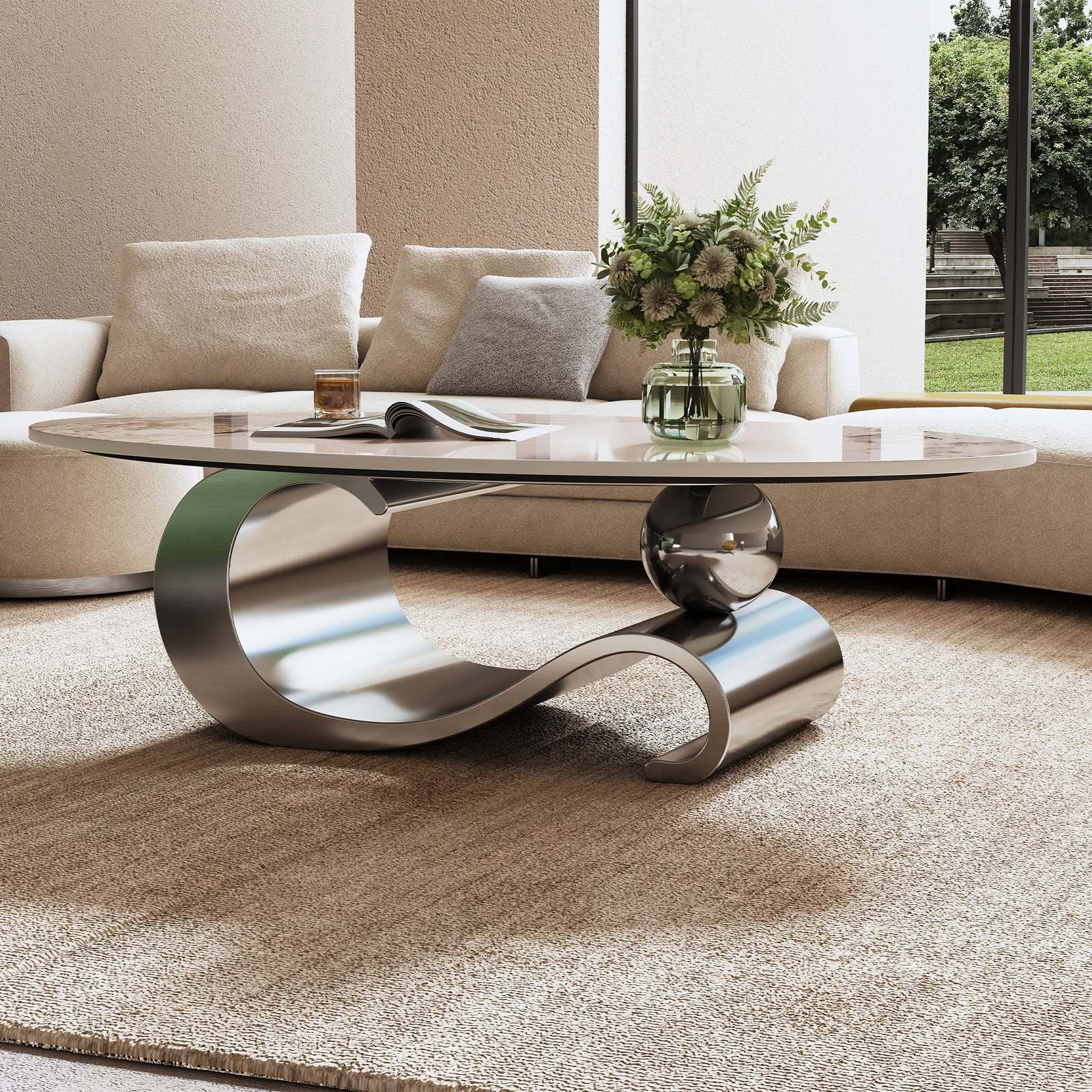 Add a touch of modern luxury to your living room with this stunning oval faux marble coffee table. Featuring a novel-pattern sintered stone top and a unique gold stainless steel sculptural base, it offers both durability and high-end design. Ideal for contemporary homes seeking an elegant centerpiece that is easy to clean and built to last. Perfect for living rooms over 15?, and pairs best with sofas of seat height 17?19 inches.