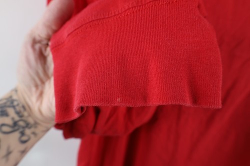 Stain right cuff. Cuffs stretched out and discolored. Graphics faded. Color faded