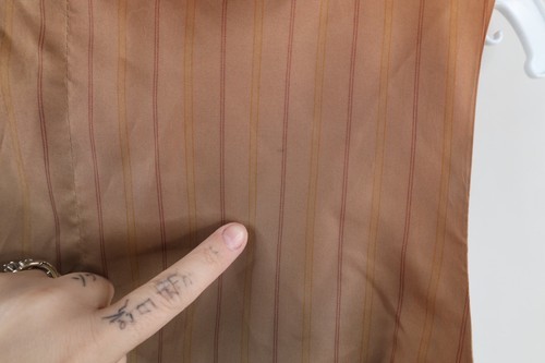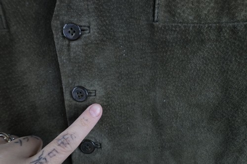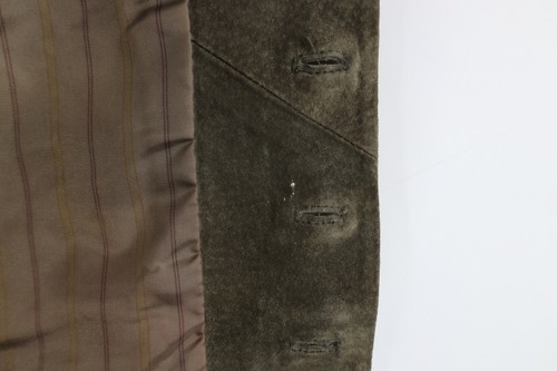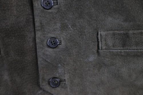 Blemishes front and back. Color fade. Buttons are loose. Inner lining discolored
