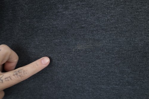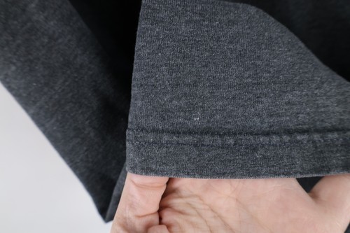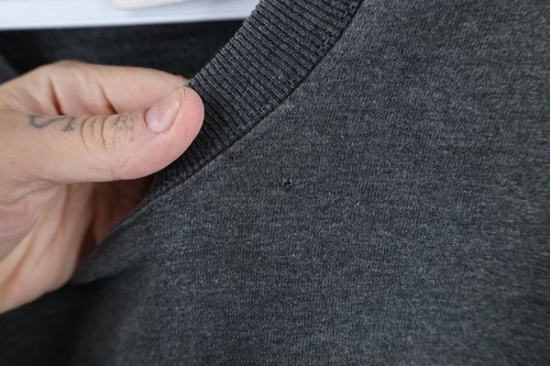Pinhole near the collar. Stains front middle and bottom, back bottom. Armpits discolored. Color faded