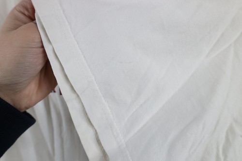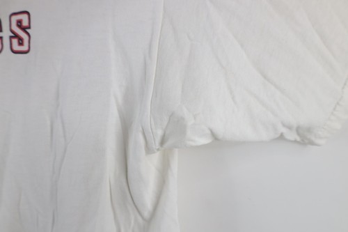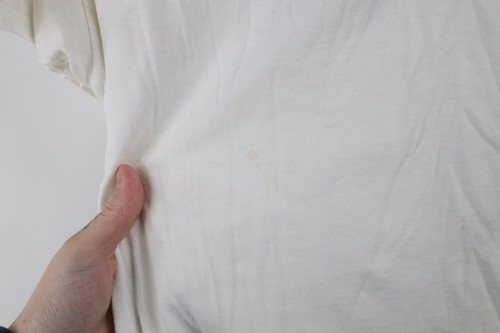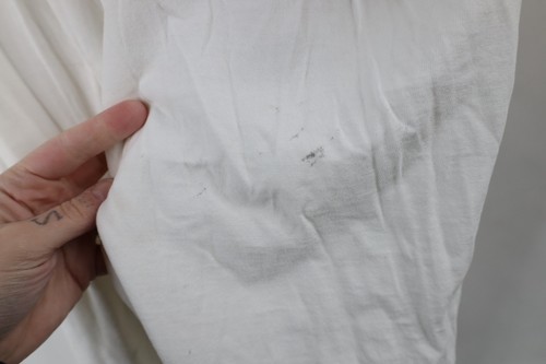 Holes collar, back bottom. Stains/blemishes front/back, collar, arms. Collar, armpits discolored. Yellowed. Graphics faded. Pilling