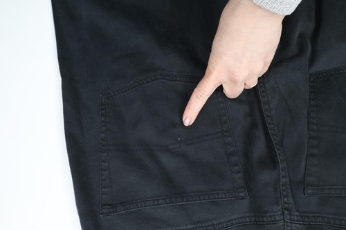 Hole back left pocket. Blemish back right pocket. Discolored and faded