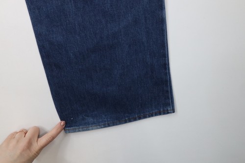 Blemishes back both legs. Thread bare back near right cuff. Cuffs, waist, fly, pockets, discolored. Distressed and faded. Loose threads. Color faded. USA made