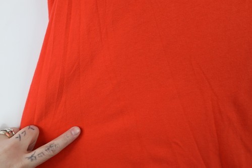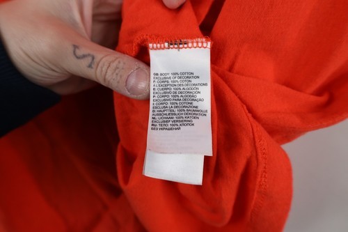 Dark spots front, back. Blemish right shoulder. Color, graphics faded. Pilling