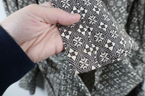 Stains front bottom. Collar, arm/cuffs discolored. Yellowed. Color faded. USA made