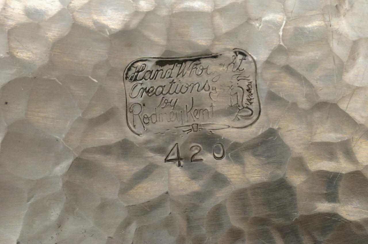MCM Mid Century Aluminum Metalware RODNEY KENT 420 Hammered TULIP Flower Tray with center handle - signed on the back. Crimped edge. Measures 11.5" by 6.6" - one scuffed area in the metal tray noted. Great on a buffet. No smoke or pet odors.