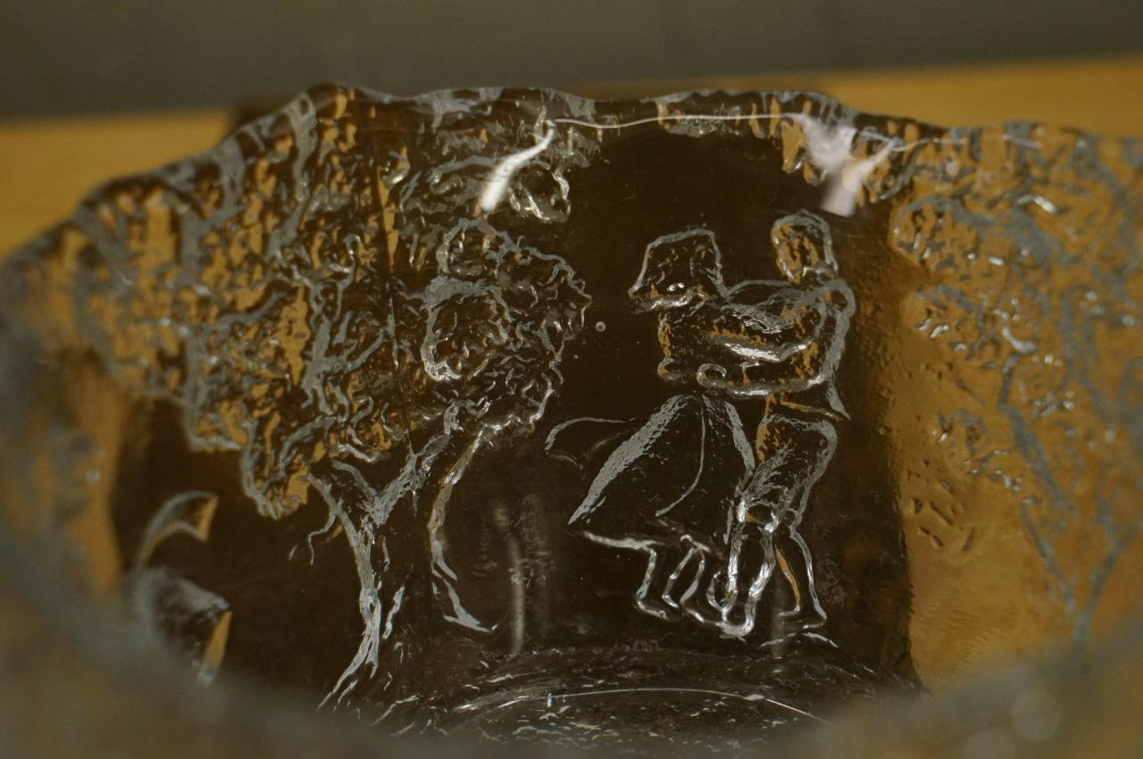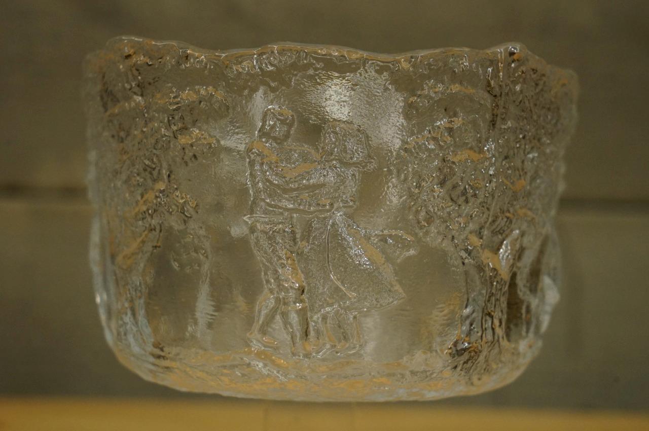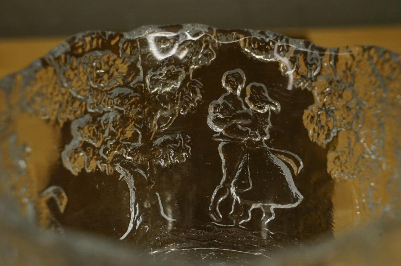 Studio Art Glass KOSTA BODA Rhapsody Bowl King Charles Sceptre Kung Karls Spira Vasterbotten and a central flower etched in the base. Measures 5.5" by 3.75" tall. Trees and dancing couples.