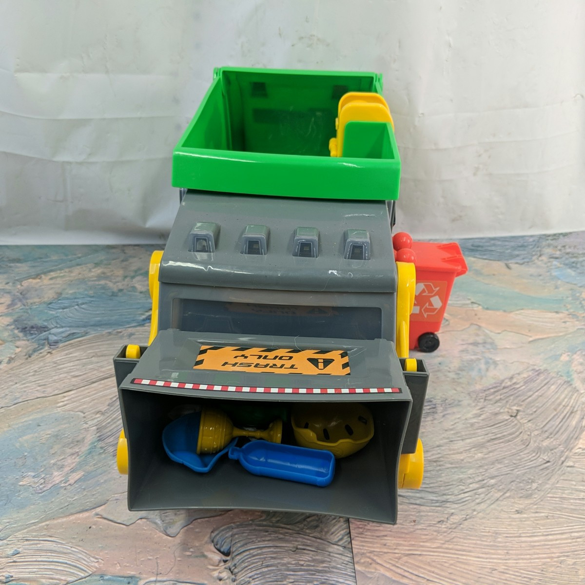 Exact item is shown. New open box with partial packaging. Tested good immediately prior to listing, makes sounds, moves. Includes both bins 7 of the 16 "trash" pieces. Item weight 2 lbs. No returns. Ages 3+. Made in China. This item is a new, opened customer return. It has been inspected and passed quality control to insure the condition described and contents are accurate. Please review actual photos as stock photos are not the actual item, our photos are. You will ONLY receive exactly what is shown in photos, regardless of what might have originally been included. Please review our business policies in our store for information regarding returns, shipping and warranties.