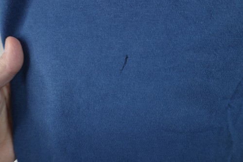 Stains front. Blemishes front, shoulders, collar/inner collar, back. Collar, arms discolored. Graphics, color faded. Pilling