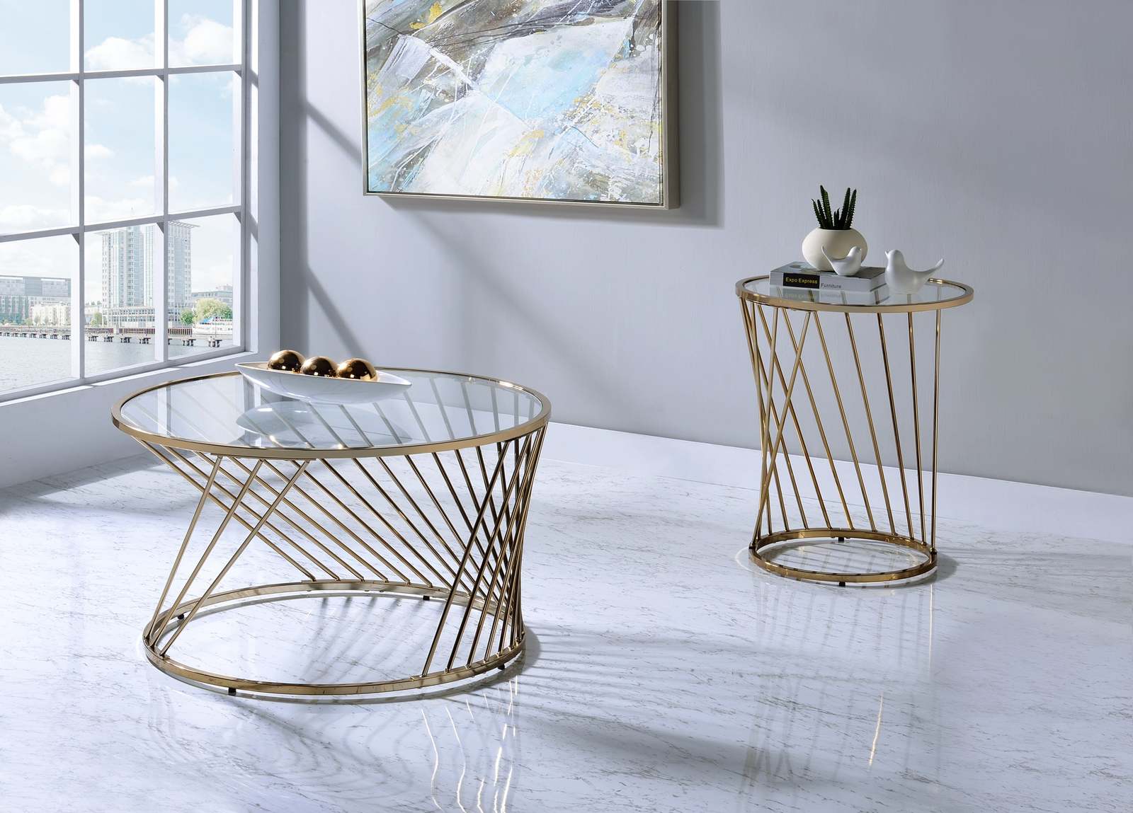 This stunning collection features a champagne-finished coffee table and end table, both designed to bring a touch of modern elegance to any living space.