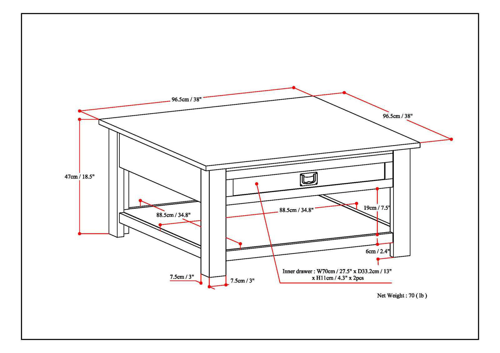 Assembled Length (in.) 38.00 Assembled Width (in.) 38.00 Assembled Height (in.) 18.50 Weight (lbs) 67.20