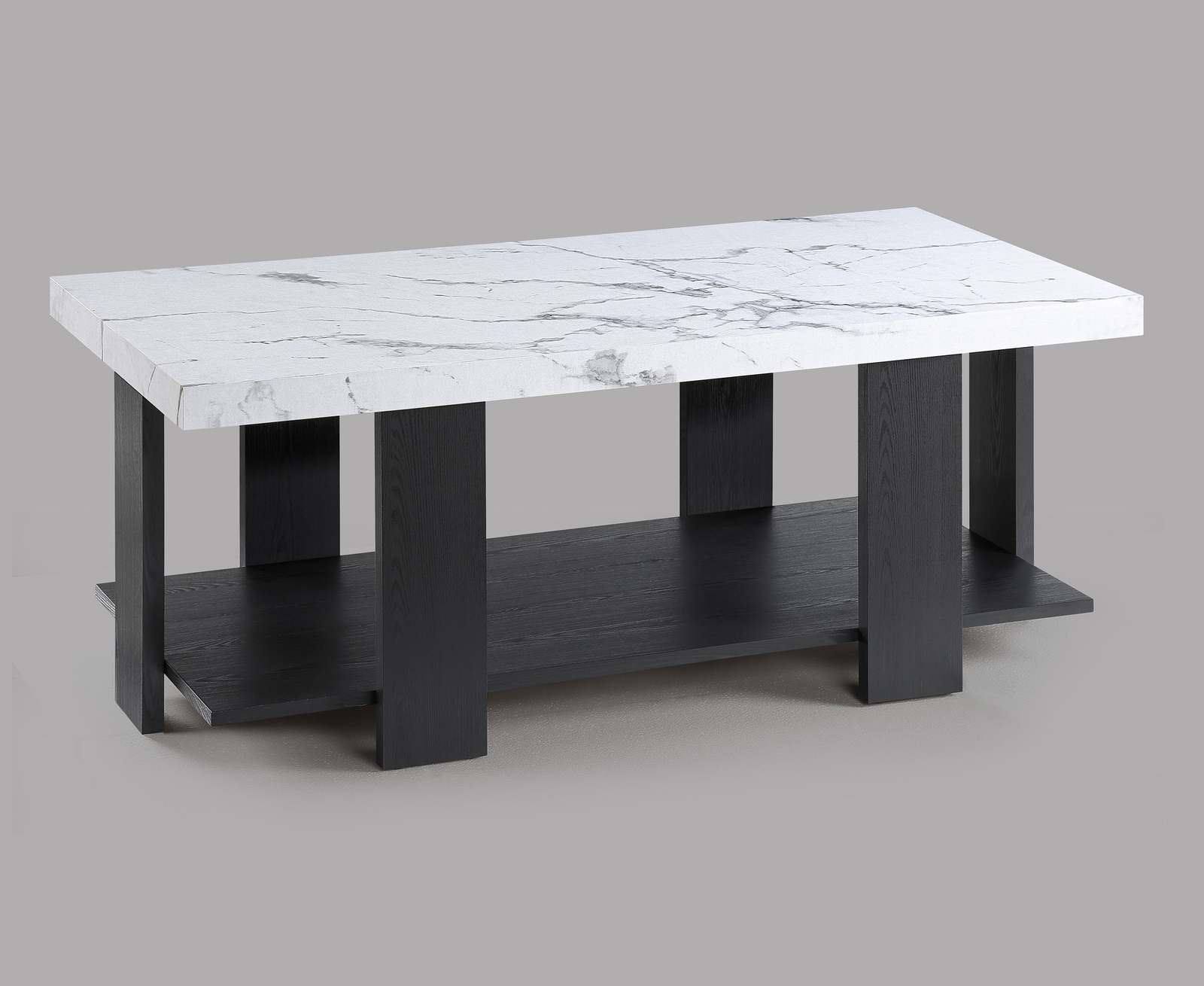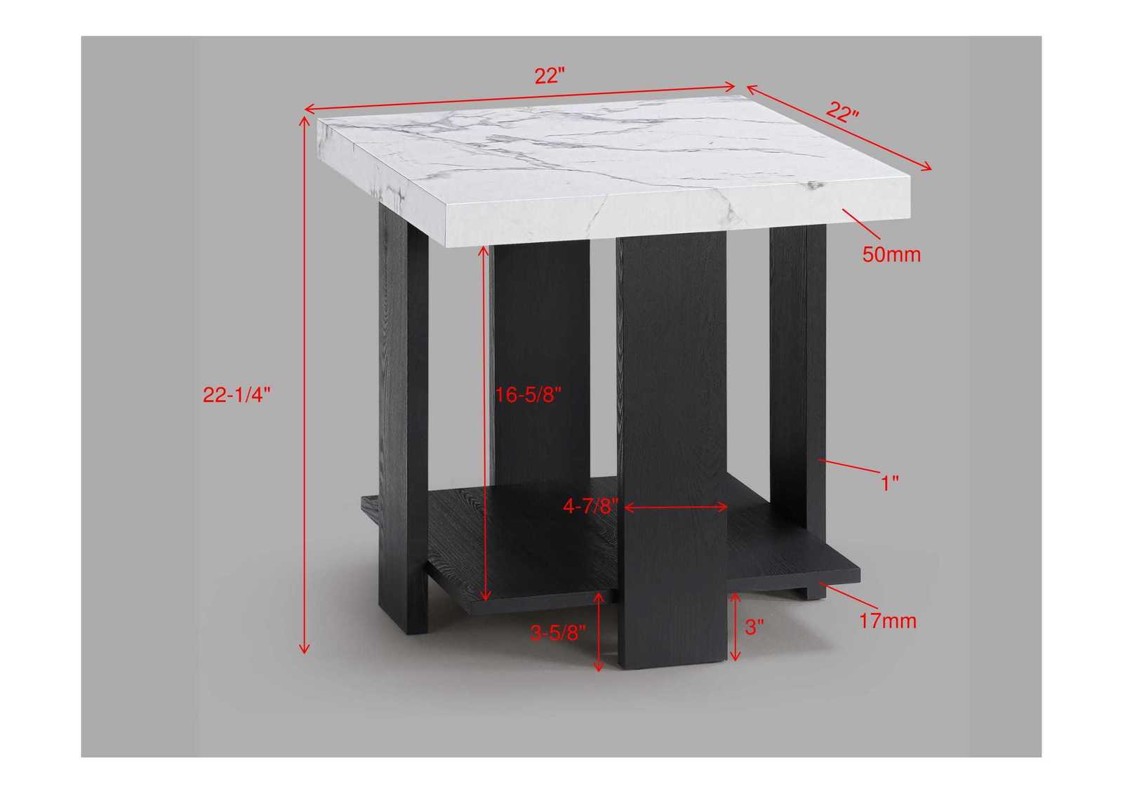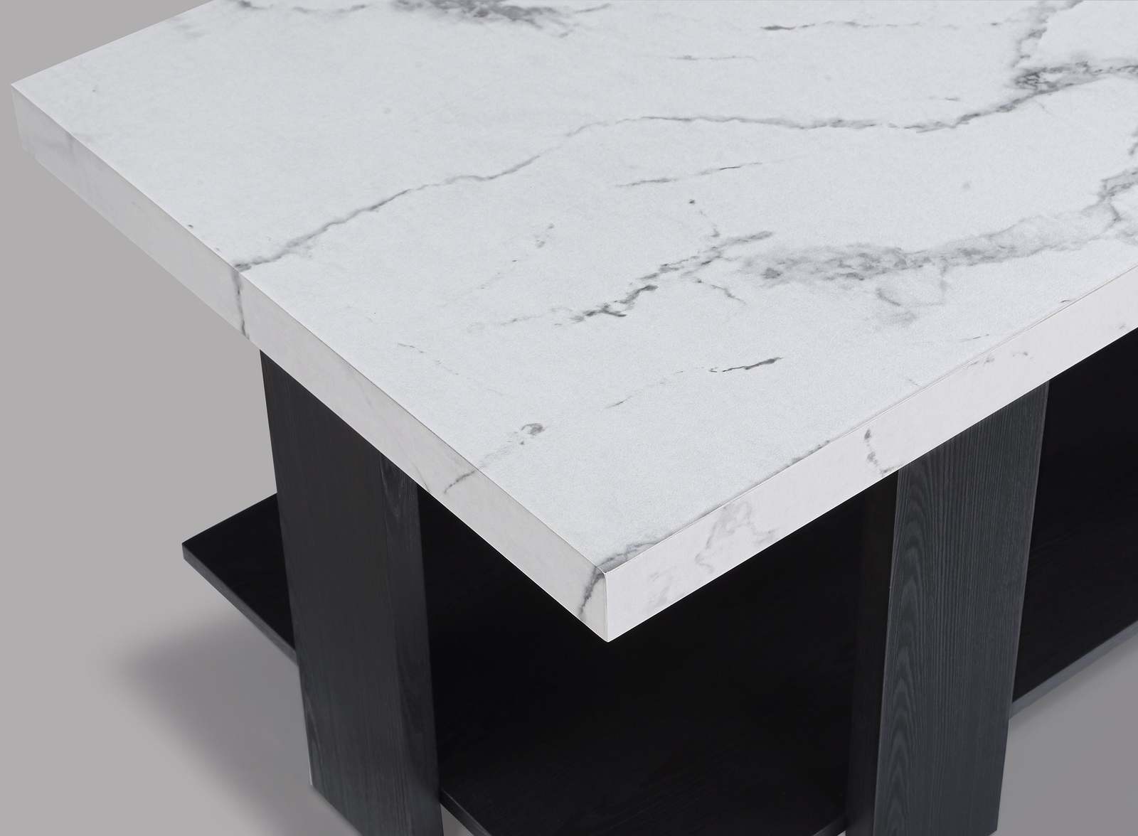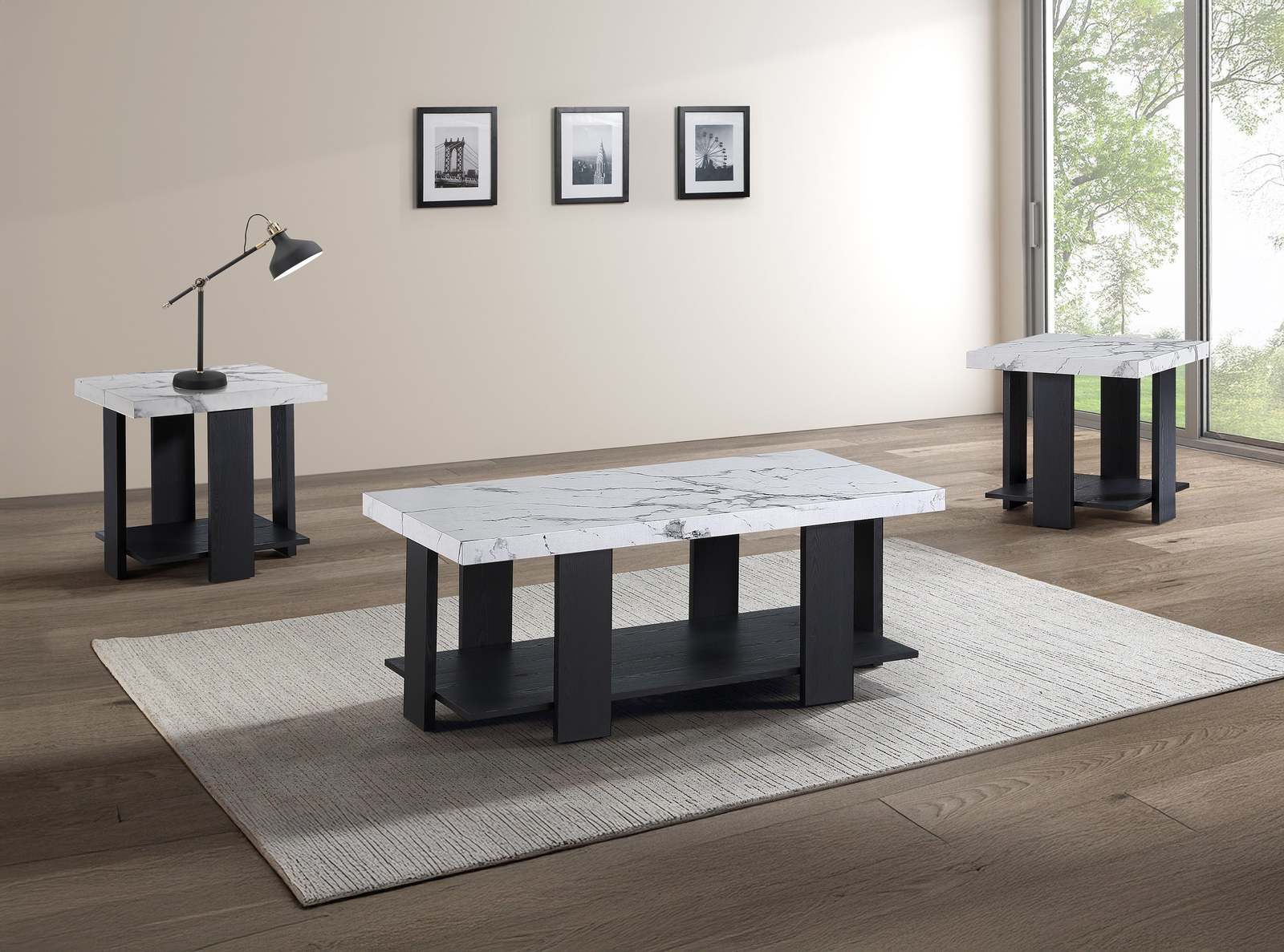 This contemporary cocktail set presents a bold statement in minimalist design, featuring a sleek rectangular coffee table as the centerpiece, flanked by two matching end tables. Each piece boasts a sturdy construction with clean lines and a striking faux marble finish in a classic white hue, embodying both durability and modern elegance.