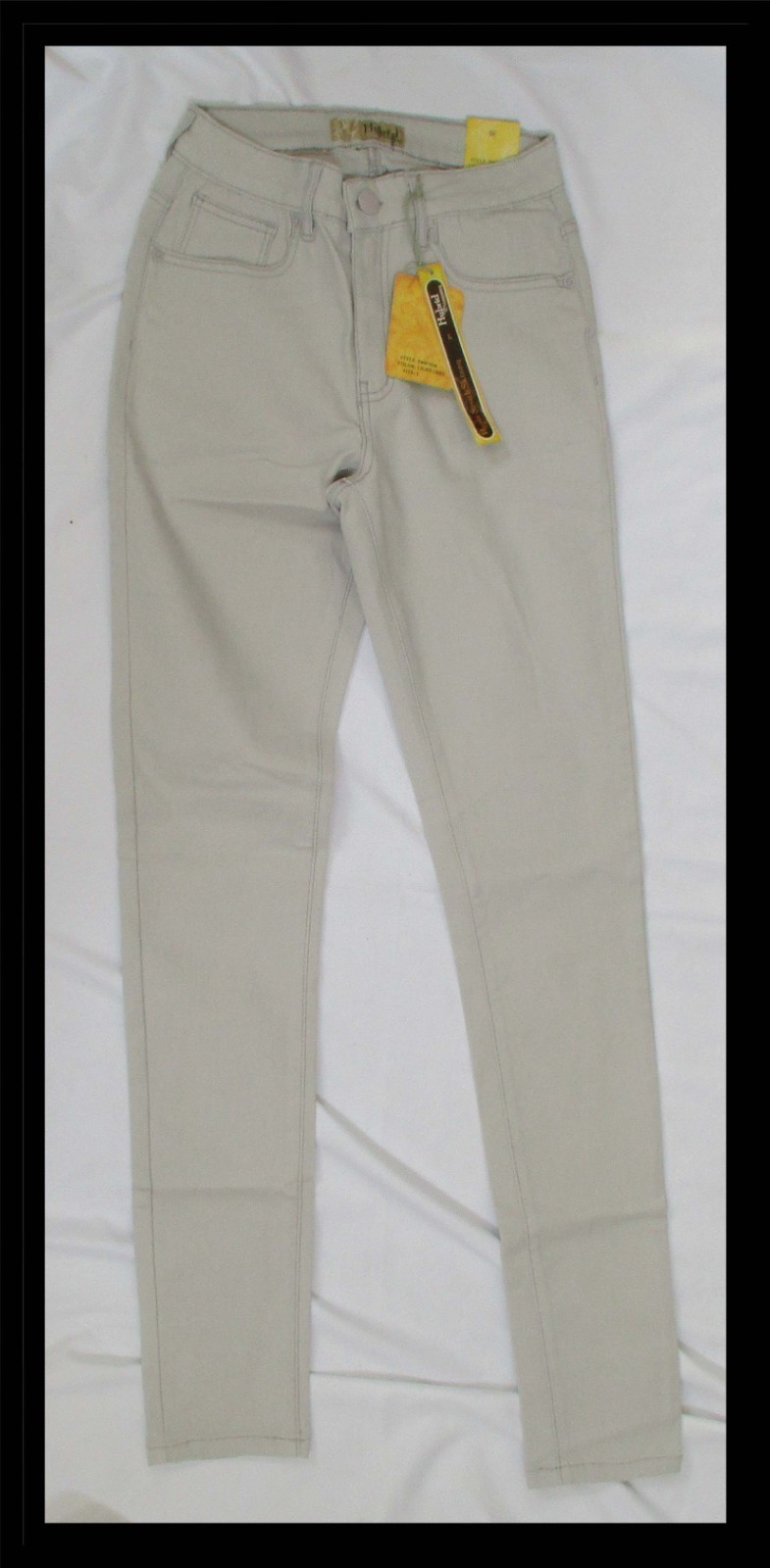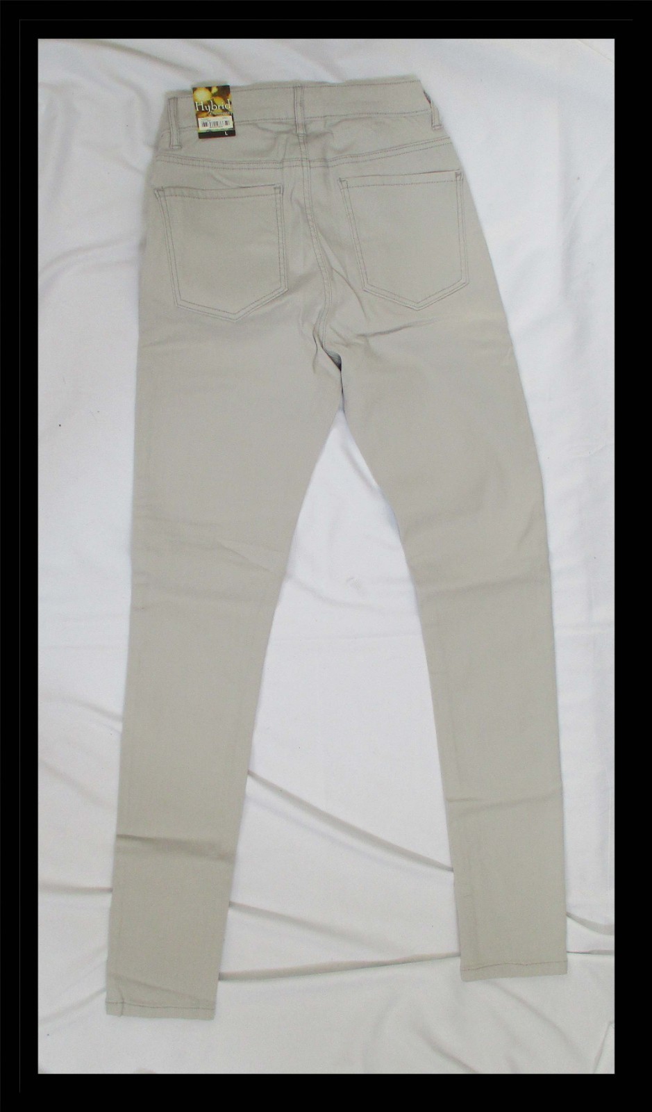 The product is a pair of Hybrid Co. ladies light gray hyper stretch skinny jeans in size L. These jeans are designed with a 5-pocket construction and a zip closure. They are machine washable and feature a solid pattern with a stretch feature for added comfort and flexibility. The skinny style offers a modern and fashionable look, making them a versatile and trendy addition to any wardrobe. Same or next day ship.
