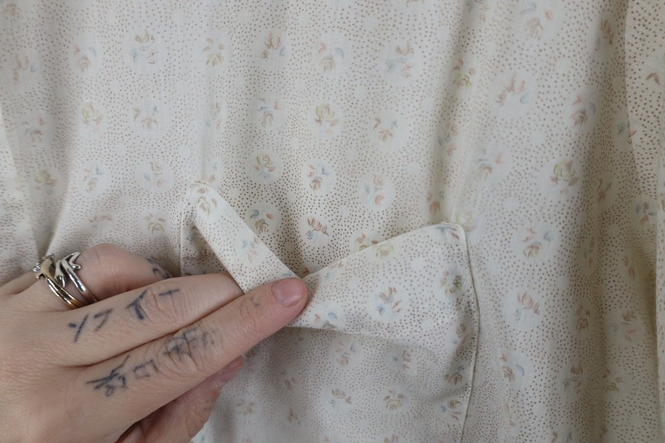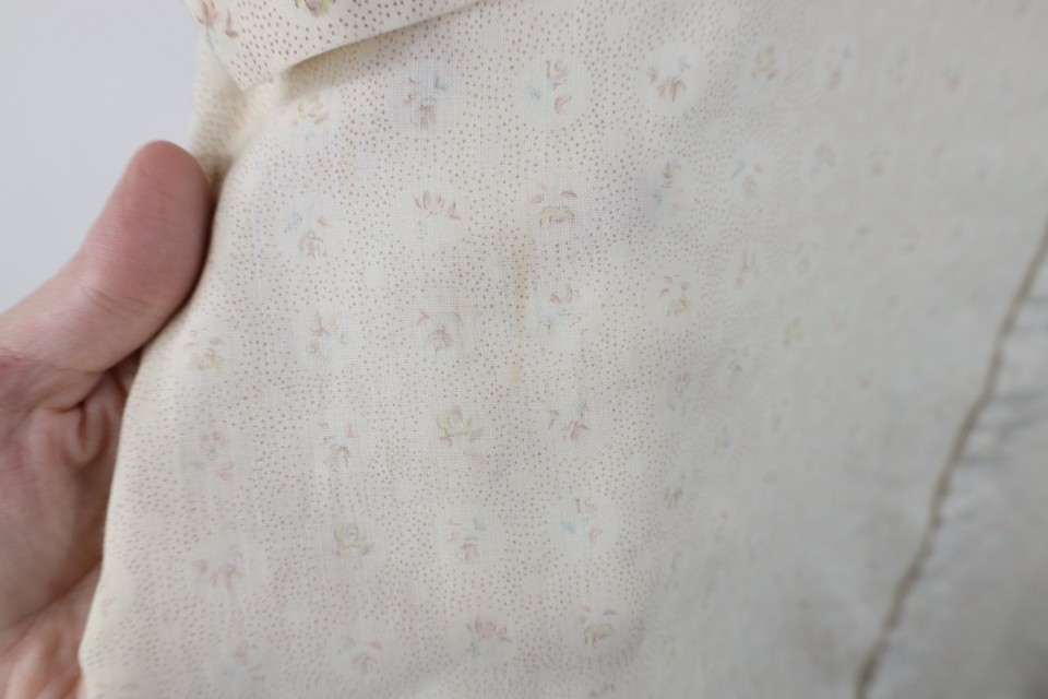 Stains front, right arm. Collar, arms discolored. Color faded. Sheer fabric. USA made