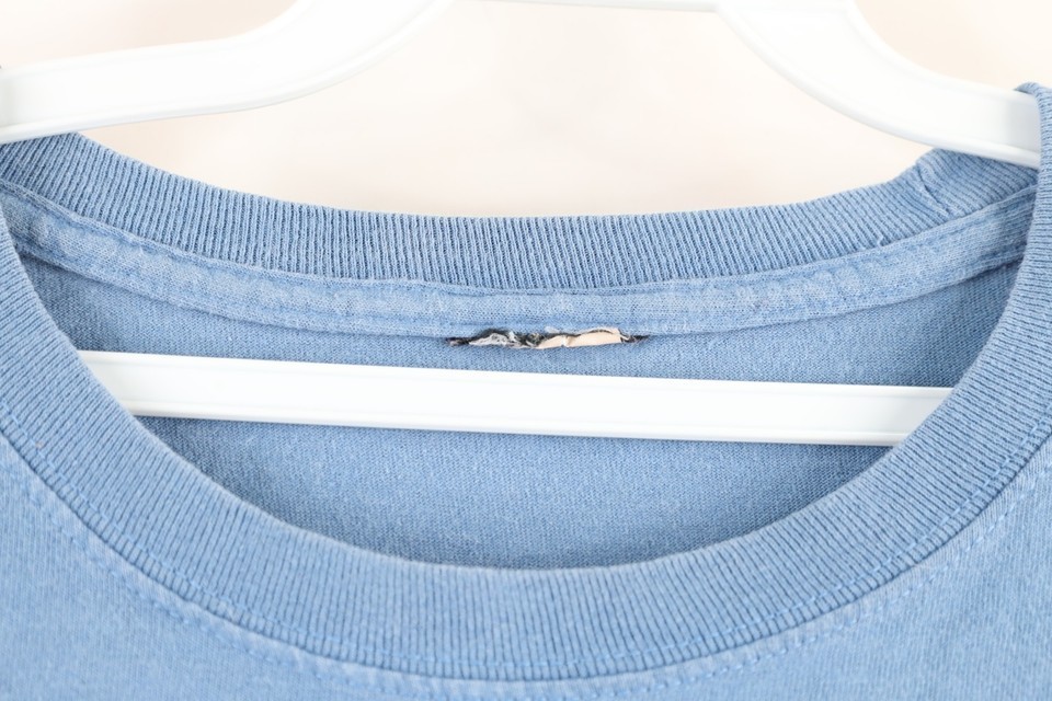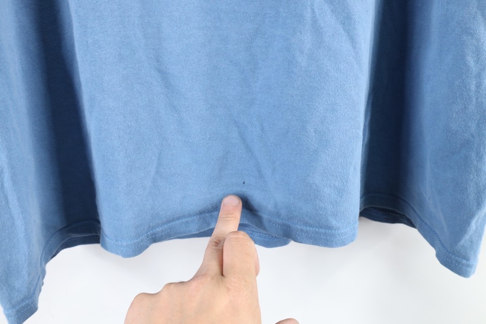 Has stains on both arms and holes on front center and bottom. Has cracking on front and back designs and color fade