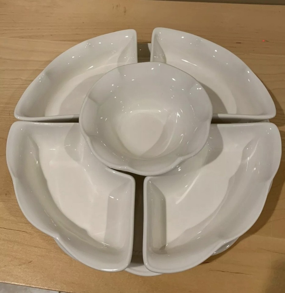 Set consists of 1 large platter, 1 center bowl and 4 crescent-shaped side dishes that can be combined multiple ways for numerous entertaining options.